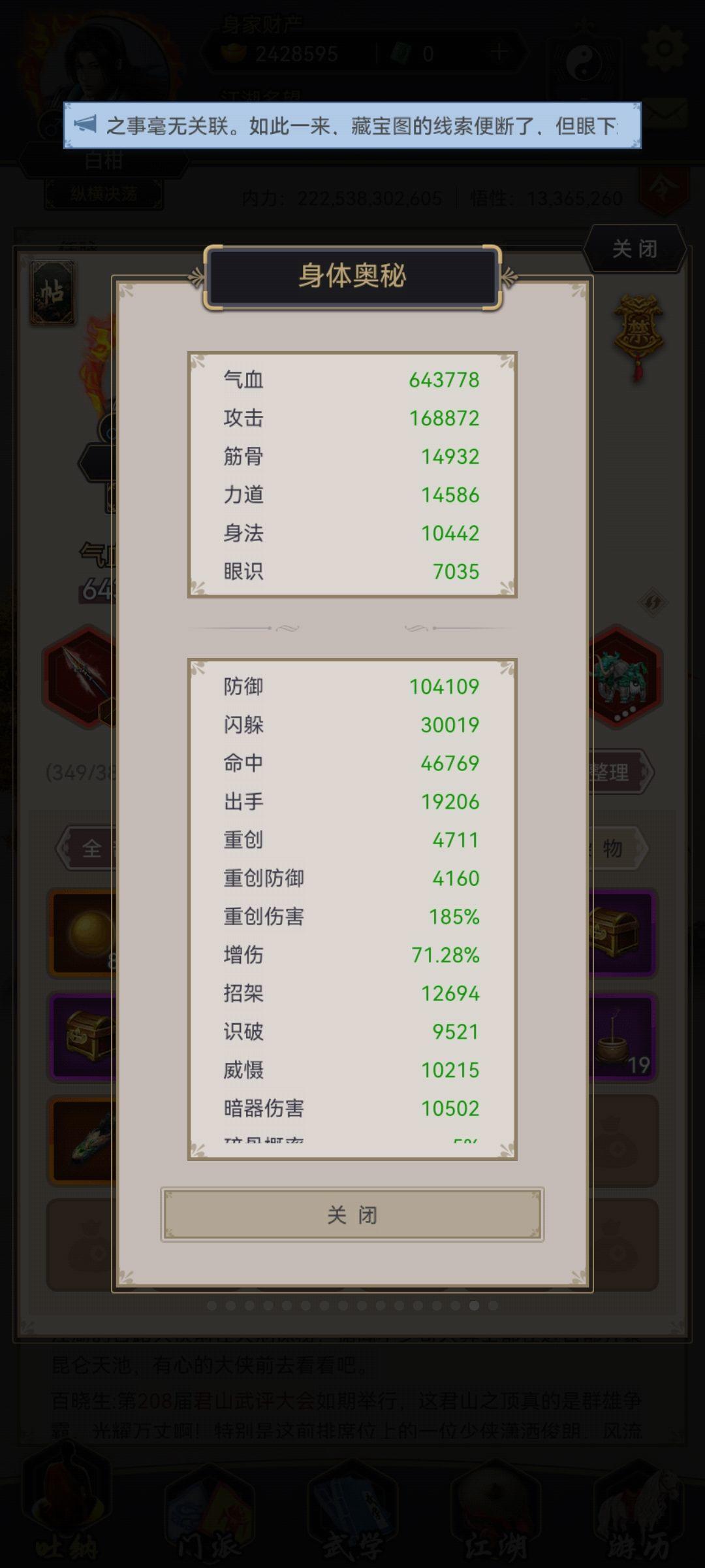 终于熬过雷火了,前天在少林寺比武台上把已经好久没上线的咱区第一给打下去的时候就觉得肯定能过甄梅了,昨天又把龙威给搞到手,今天也是一次就过。三象还差的远,金身也才到不破,还有的熬,技能也好久没整理了,现在活动送的那些八星武学我都给存着没用,实在是格子不够了。前天和往常一样在少林寺比武台拿大佬刷武学熟练度,突然给我跳出来个挑战成功,哈哈当时真的很意外,大佬玩的身法剑以前都是人家剩下半血,少林寺比武台