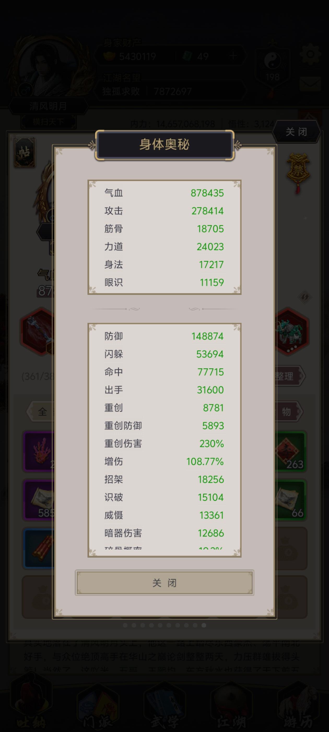 1、对局情况(阴天,流云剑阵)2、属性记录3、主动武学4、反击回击判定比反击优先,回击出了反击就没法出5、不占出手6、极意武学7、阵法、弟子、挡刀注:弟子挡刀率在37~38%是比较适合的范围,基本是挨一到两下打,能比较容易出半血传承,枪半血传承必中,可以不用磨砺命中,也不用命中天赋,只要扛得住就行,因为弟子武器寒冰有概率亏反击,我把前三回合的弟子武器都给下了,不过这东西就是看运气
