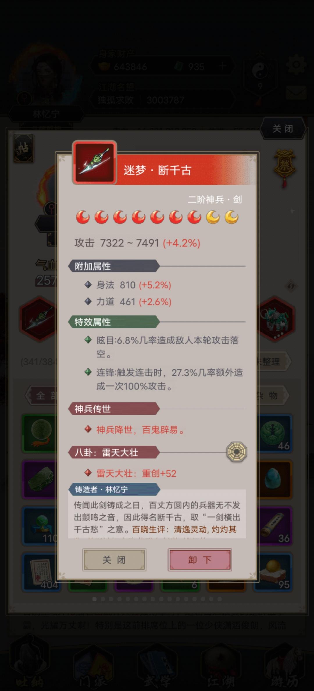 之前梭哈了几次断天涯,始终过不去。经过好几天的绝食攒黄金,养了养弟子,一下就过去了。不知道还能走多久,但还是感谢朋友们的陪伴。