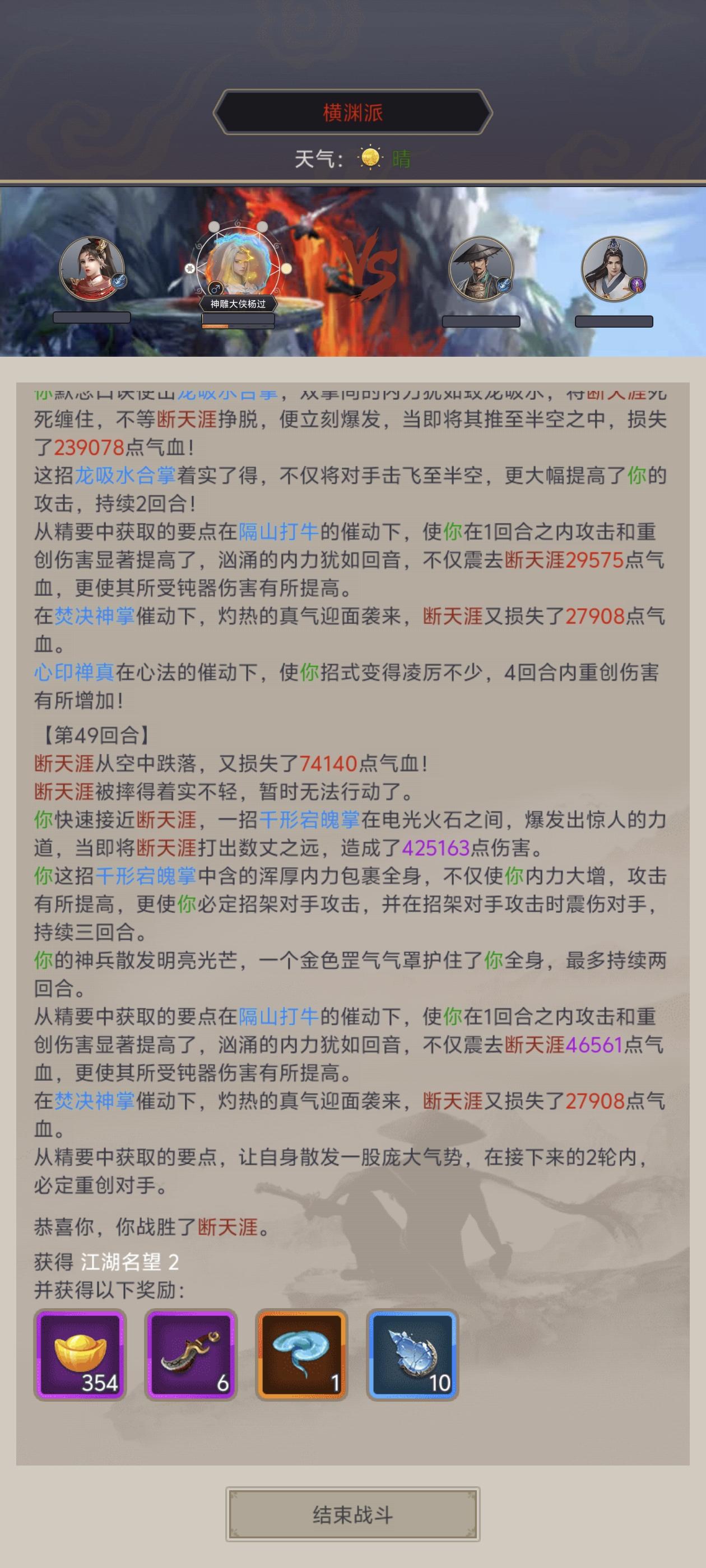 之前梭哈了几次断天涯,始终过不去。经过好几天的绝食攒黄金,养了养弟子,一下就过去了。不知道还能走多久,但还是感谢朋友们的陪伴。
