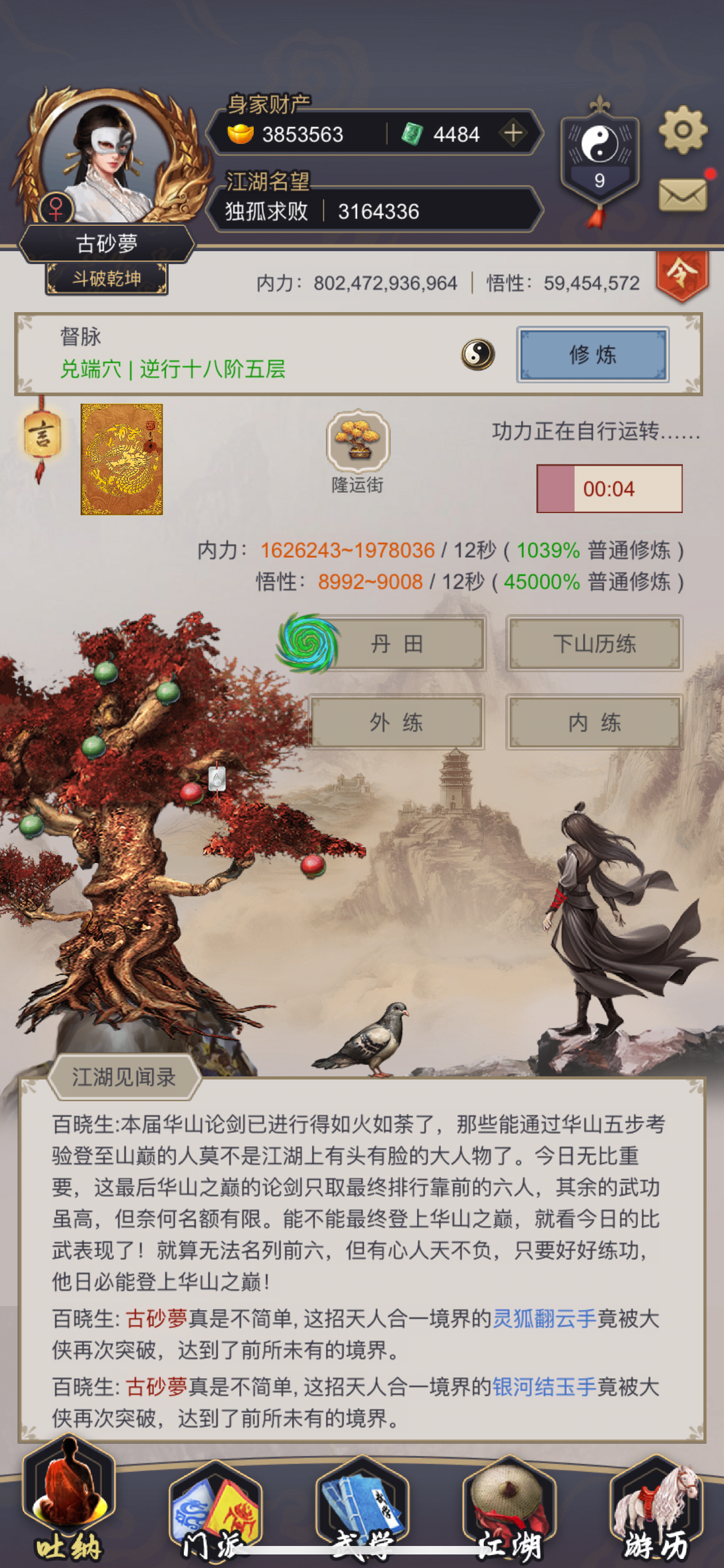 隐藏成就系统说明-江湖飘零-大鸽子出品[吐呐界面]左上角悟道树上面有一只会飞的大雁,是可以点击的,当没有成就奖励时可以随机获得50-100黄金,有成就奖励时可领取。注1-成就奖励每天只能领一份,即使己经完成多个成就一天只能领一份成就的奖励。注2-大雁一天刷新3-4次。注3-相同成就奖励只能领一份。隐藏成就名称-达成条件-奖励1.次日登陆礼1-再次登