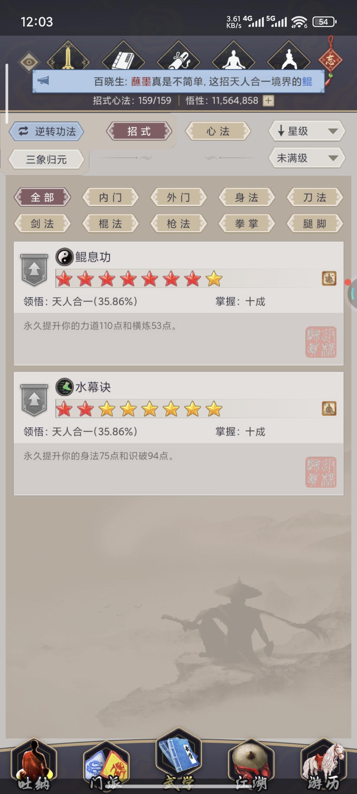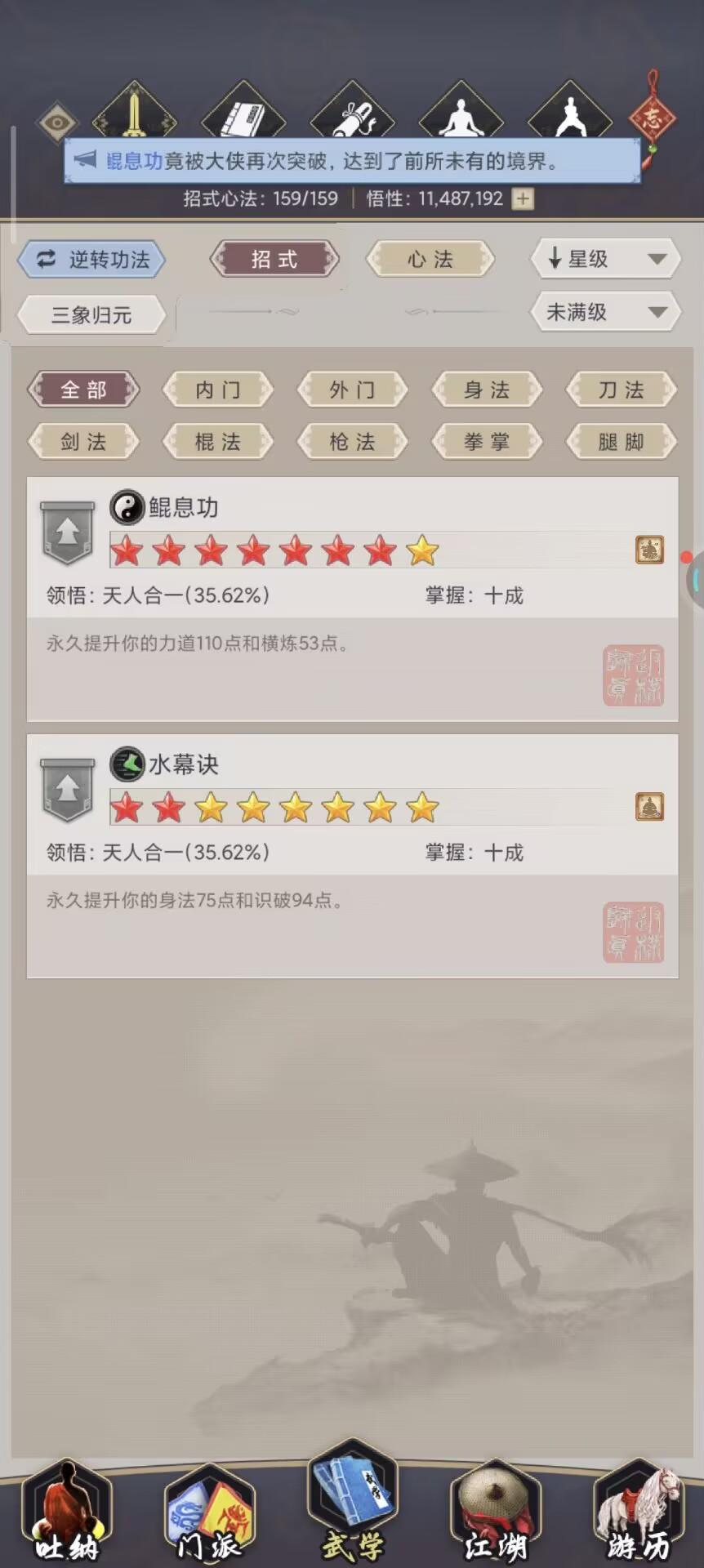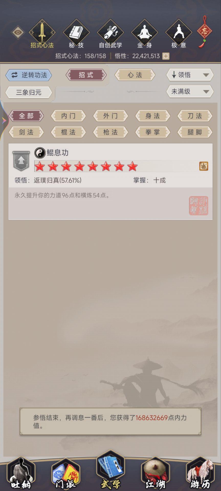因为没内力卡洗髓摆烂好长一段时间。今天有点进步。庆典:九身,隐居贴,江海精要还没拿。抱元心印只有云枢满了。江海的提升应该是比较明显的。西域火枪还没满,目前看来黑血更胜一筹。主要还是暗劲不太够,提升主要是慢慢熬诸子百脉和洗髓,特别好的方法也没有。岁星同理,也用的黑血。开局吃了个天机连星斩,掉了80w血,勉强算是心法吃满了。弟子用棍腿,腿不必多言,棍子目的主要是封招,不然第五回合一个血印直接触发