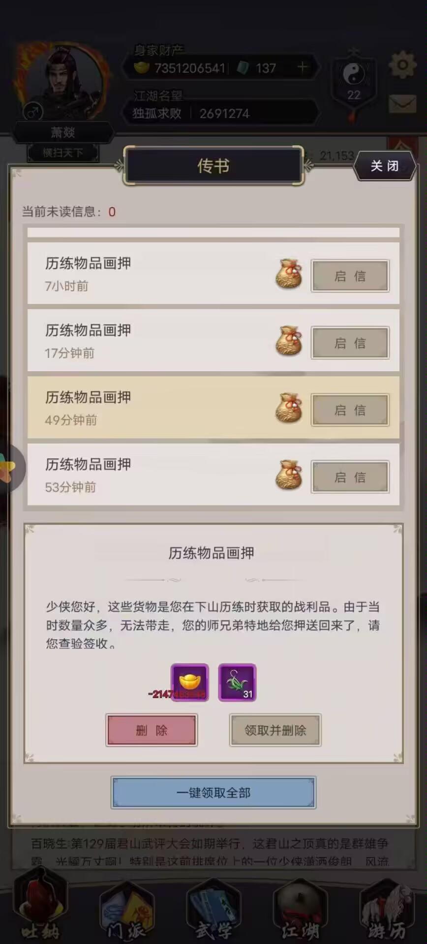鹤顶叟:签到五天,共3珍珠,10锦盒,3金箱子,27776黄金青囊子:四档奖励兑换玄霜:小游戏,40锦盒,7500黄金百草翁:黄金/玉璧购买锦盒孟云归:武学,真解,精要兑换白嫖可获取40*2+15*5+6*5+40+10=235锦盒第一档,白嫖八星内门+8刀令+2袋简注235-120-13*8-5*2=1锦盒第二档,八星内门+八星外门需240,240-235=5锦盒氪6玉璧第