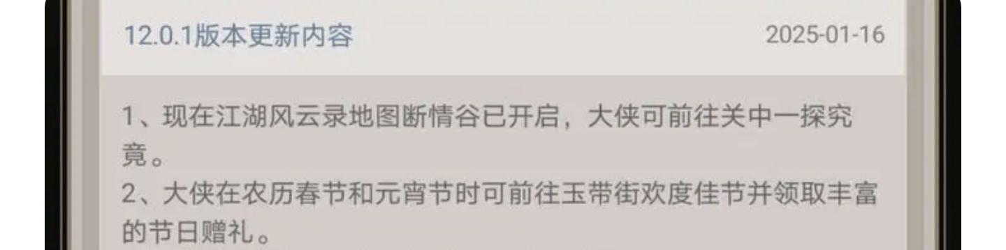 1、玉带街将在2月中旬举行欢度庆典,届时大侠可前往玉带街轻松获得武学、名帖和各种奇珍异宝。2、二月初丰泽坊三楼大掌柜将给予每位侠士双倍的回馈奖励。3、现在城隍庙的塞北游商处增加了暖冬锦盒的相关兑换。4、修复了江湖风云录地图-天音囚牢中,不正确的天气显示问题。5、修复了月魂摄魄功进阶后,精要:月蚀不生效的问题。6、修复了部分精要触发后,战报目标显示错误的问题。7、修复了护心镜与部分武学无