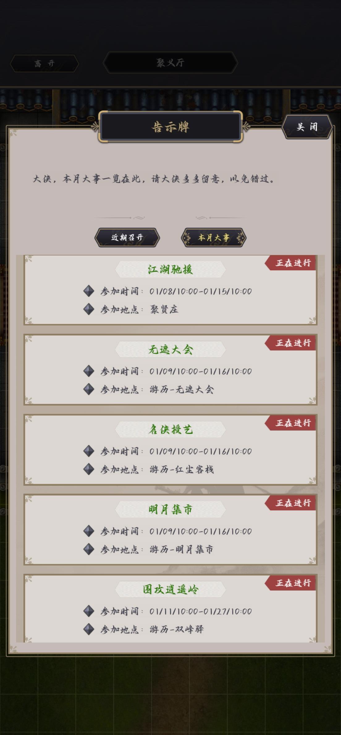 隐藏成就系统说明-江湖飘零-大鸽子出品[吐呐界面]左上角悟道树上面有一只会飞的大雁,是可以点击的,当没有成就奖励时可以随机获得50-100黄金,有成就奖励时可领取。注1-成就奖励每天只能领一份,即使己经完成多个成就一天只能领一份成就的奖励。注2-大雁一天刷新3-4次。注3-相同成就奖励只能领一份。隐藏成就名称-达成条件-奖励1.次日登陆礼1-再次登