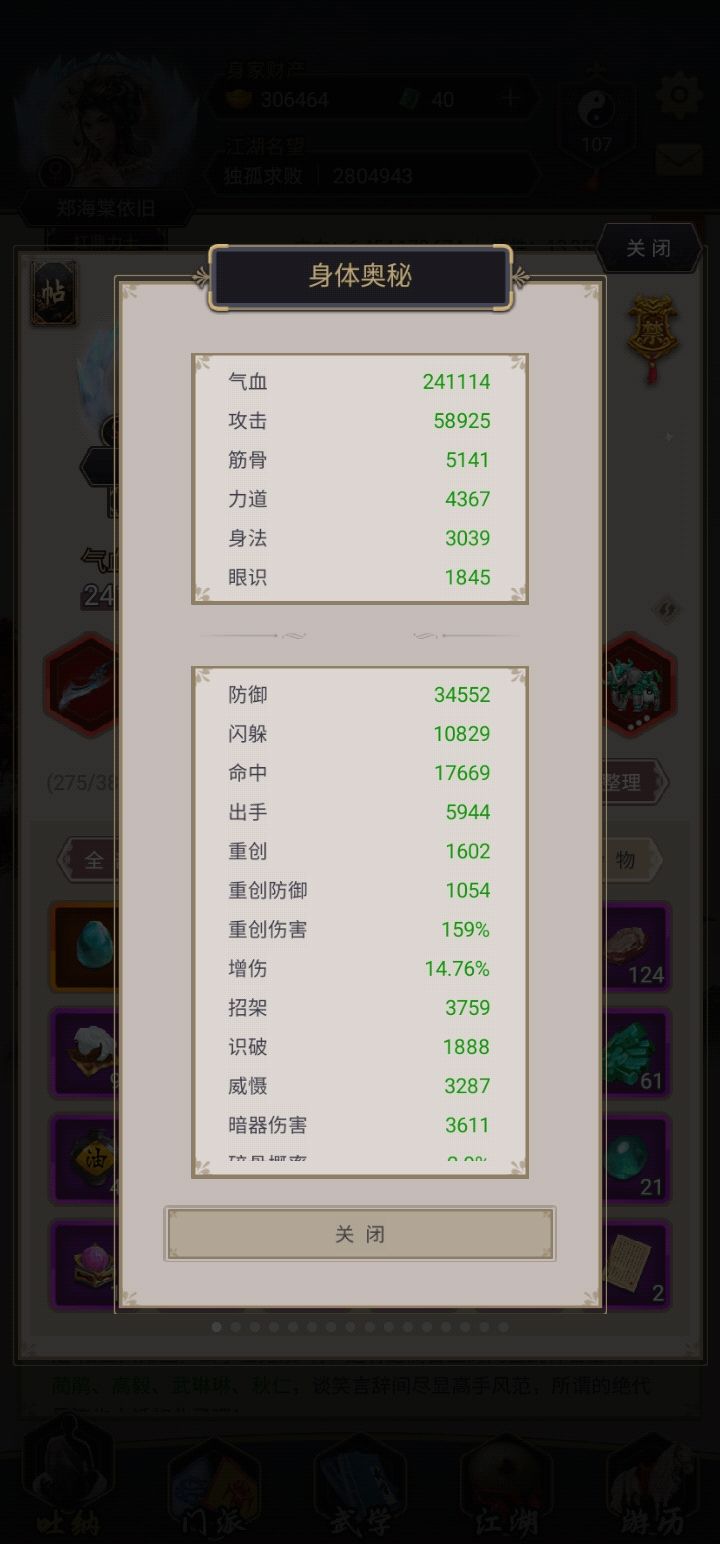 1、对局情况(阴天,流云剑阵)2、属性记录3、主动武学4、反击回击判定比反击优先,回击出了反击就没法出5、不占出手6、极意武学7、阵法、弟子、挡刀注:弟子挡刀率在37~38%是比较适合的范围,基本是挨一到两下打,能比较容易出半血传承,枪半血传承必中,可以不用磨砺命中,也不用命中天赋,只要扛得住就行,因为弟子武器寒冰有概率亏反击,我把前三回合的弟子武器都给下了,不过这东西就是看运气