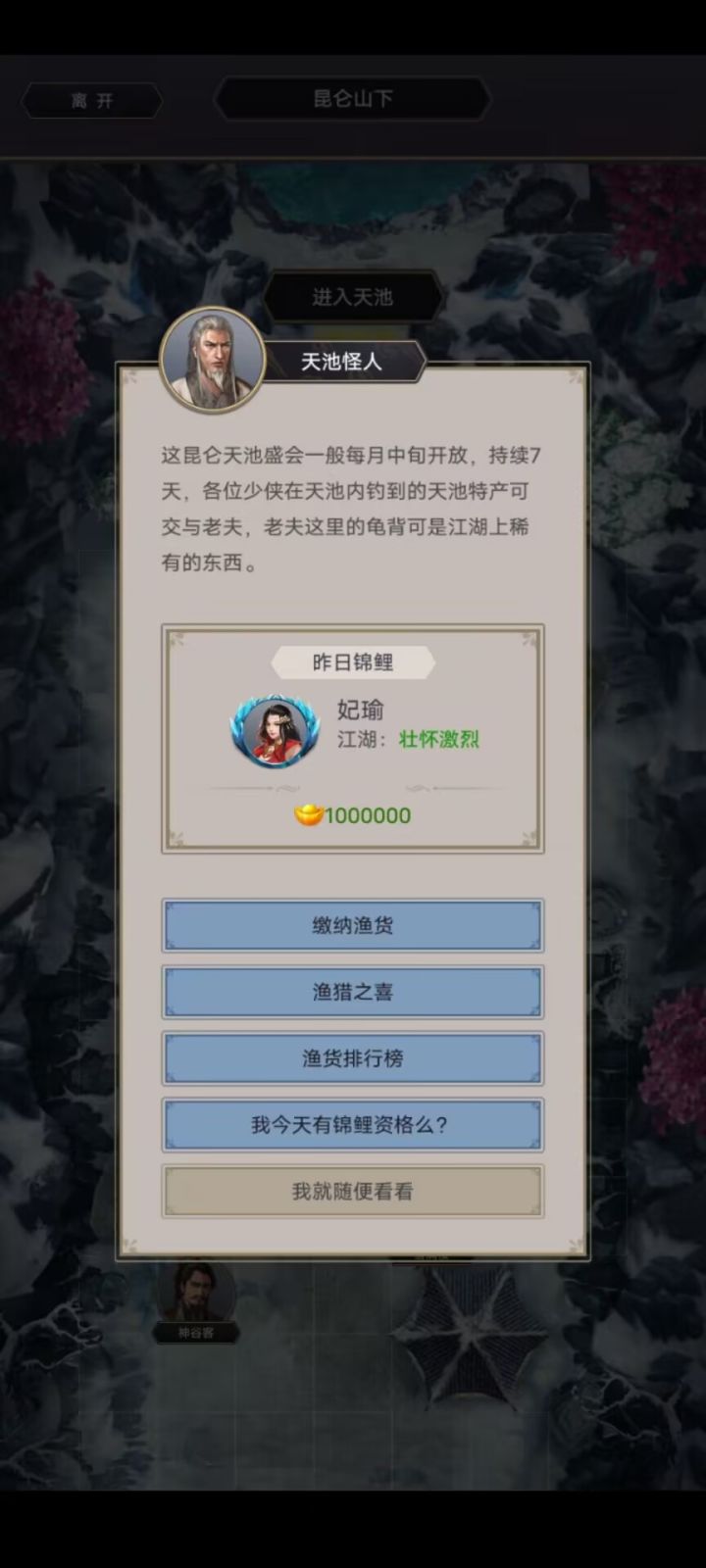 嘛,在醉高歌玩得还是很开心的,18个月来,4次天池锦鲤,2次蒙彩,除了说书人,基本中奖类都拿过吧,应该是醉高歌大区第一锦鲤了吧?但是最近江湖真的是在走下坡路了啊,很多恶性bug一直反复出现,修复还慢,是时候要找新游戏了……