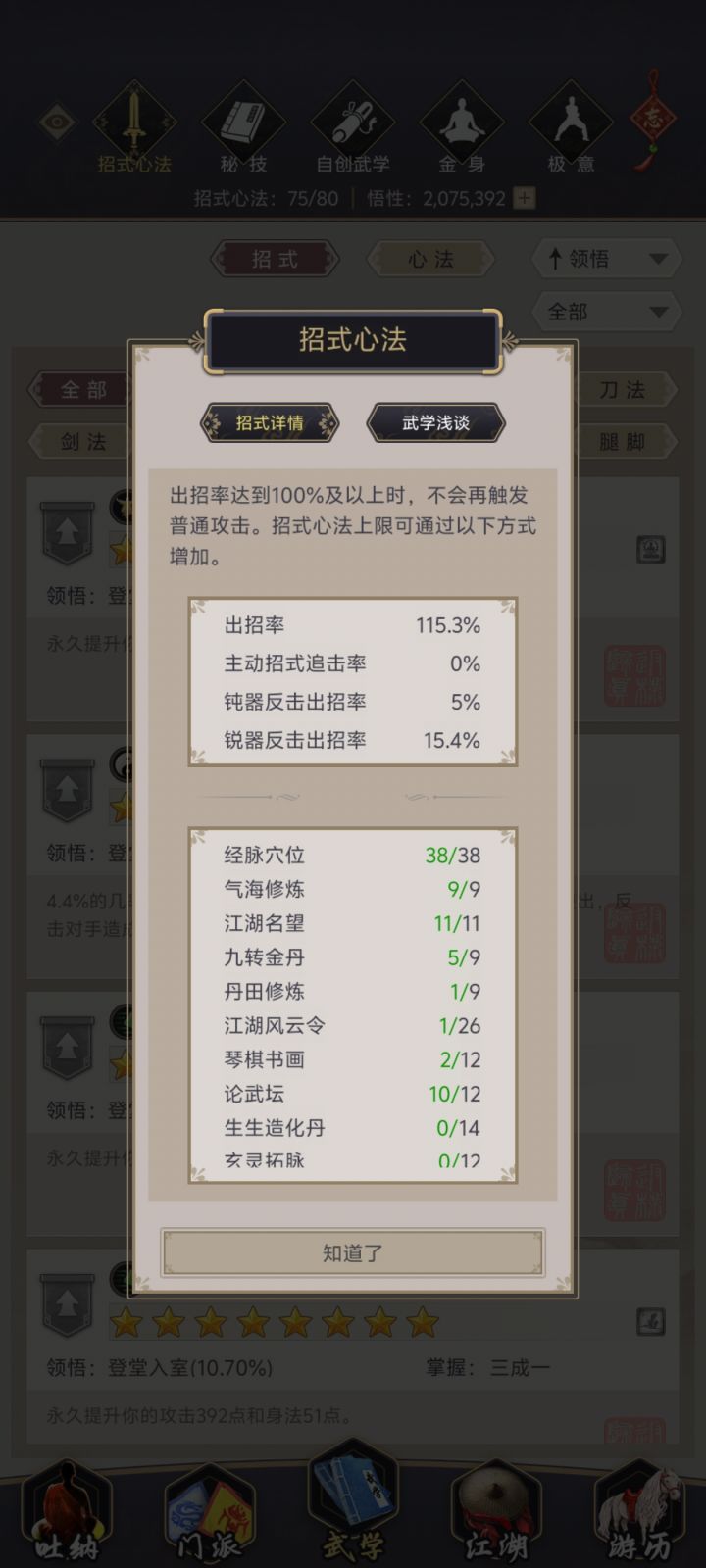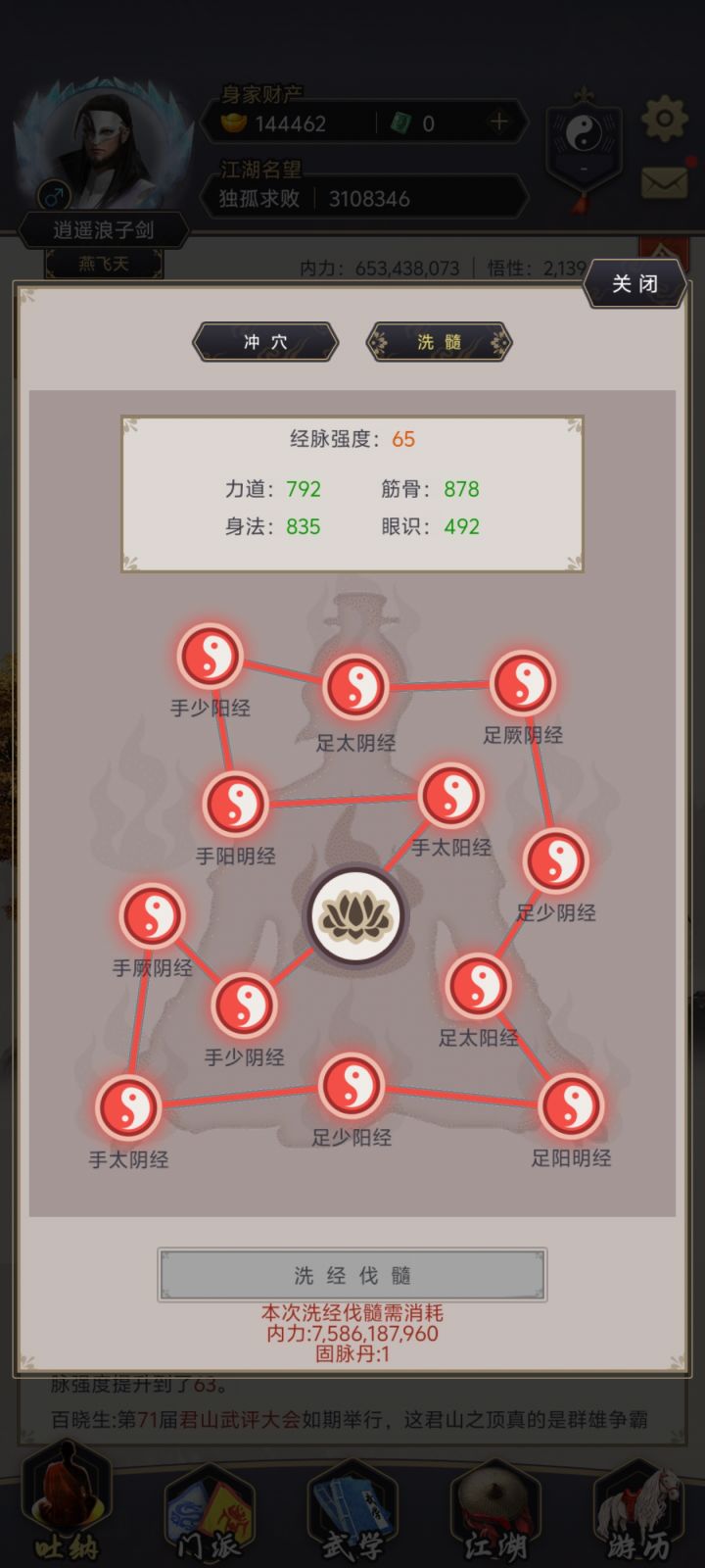 兄弟们,玩这个游戏很久了,纯小白入坑,一直当休闲玩,不氪金,慢慢磨。现在是身法剑,洗髓65级,身法8549,卡在七星堡第一个BOSS司空虎这里,十二正经开不了。我知道打赢他才能拿《斗宿经》解锁正经,也知道身法节点点了就能破万,但就是打不过。技能带的是追魂剑、寒风、沧浪、雾隐这几个高星技能剑,心法游龙惊鸿也有,被动能塞都塞了。面板闪避12.2万,按理说够了,但进去就是打不过。丹一颗没动,攒了
