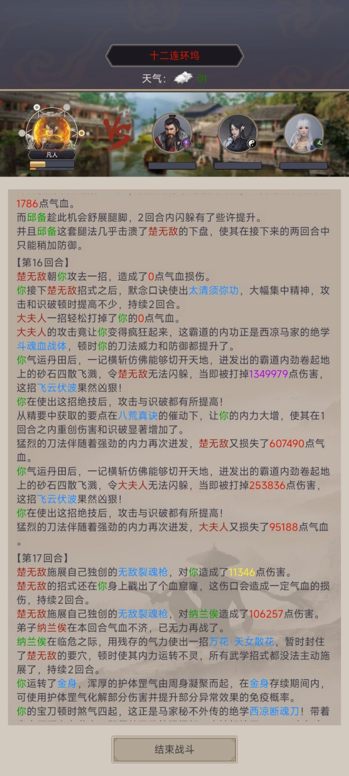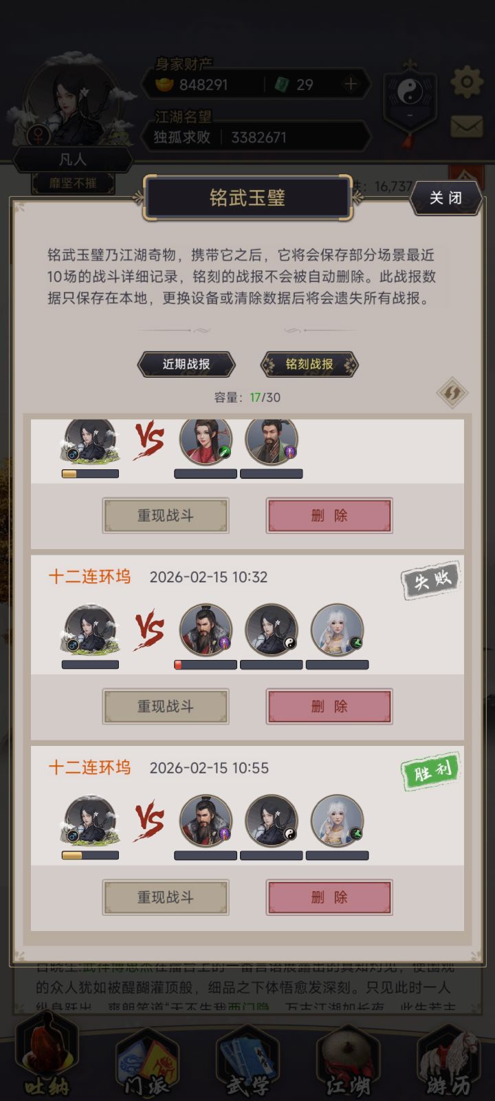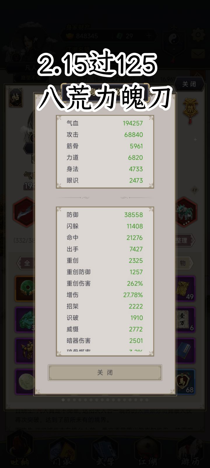阴天赌了10多次,逆行二十六阶十层,洗髓86,中丹田三十四阶,99格子,拳御17,枪御39,断潮崖枪伤害减少百分之一,神兵差3个月亮3阶。3个9主,九鼎,金阙,帝星,唐们两个9被都有,有名刀,中间退过一段时间,过关是闪了一次,加晕了一次,最后为赤子的加成+地龙+太清+斗魂+飞云(满红星)打了100W的伤害也是我第一次打超过100W的#这就是江湖