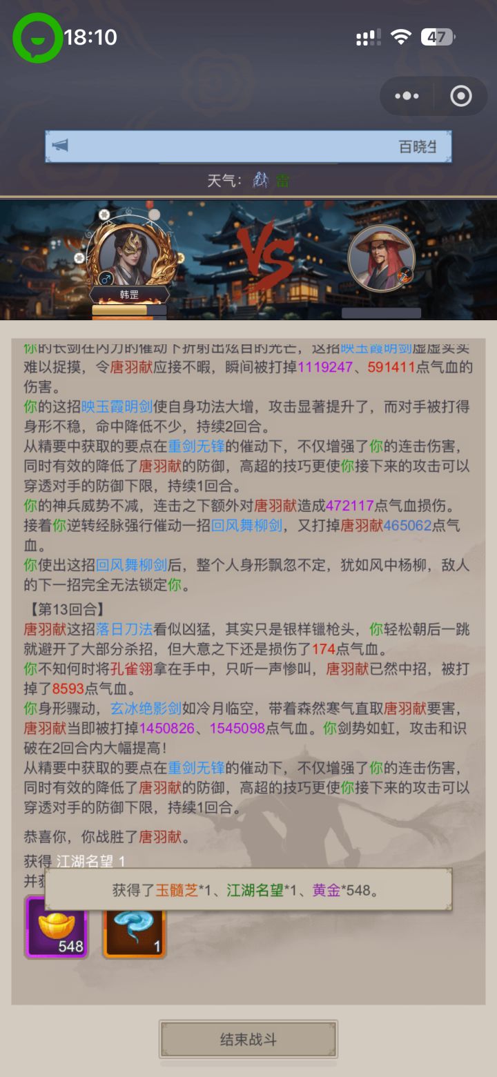 1、对局情况(阴天,流云剑阵)2、属性记录3、主动武学4、反击回击判定比反击优先,回击出了反击就没法出5、不占出手6、极意武学7、阵法、弟子、挡刀注:弟子挡刀率在37~38%是比较适合的范围,基本是挨一到两下打,能比较容易出半血传承,枪半血传承必中,可以不用磨砺命中,也不用命中天赋,只要扛得住就行,因为弟子武器寒冰有概率亏反击,我把前三回合的弟子武器都给下了,不过这东西就是看运气