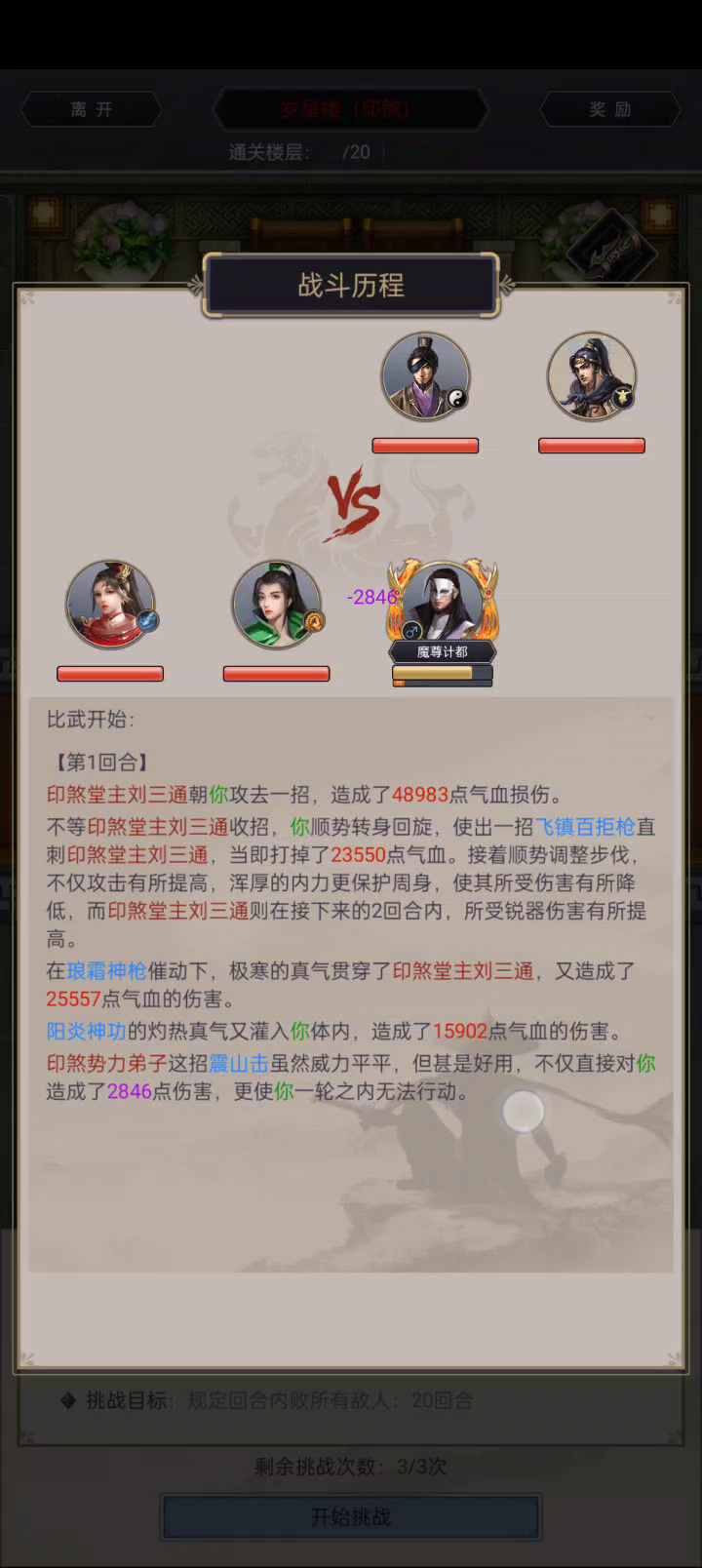第一回合:飞镇反击23550,神功伤害25557,拳弟子天舞2449+腿弟子飞星流云5213=7662,战象技能15236,副武器伤害25784,第一回合共——97789伤害 第二回合:鬼魅幽煞枪166972,神功伤害25557,拳弟子分筋错骨5698+腿弟子天舞飞仙9051=14749 第二回合共—— 207278伤害 第三回合:名刀92634,天机落星刺230671 神功伤害25557*2,拳