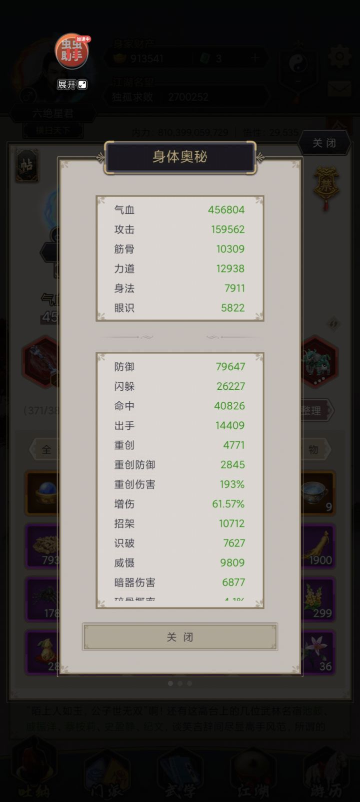 这个面板刚刚过藏剑,阵法身法拉满,风天能闪很多了,boss小怪都可以闪。我认为藏剑难过主要是boss和小怪技能太恶心,因此想拉高身法,即便闪不了boss闪小怪也好。实际3.5w闪boss小怪都能闪。前面说的百花横渊身法流也很好过。 #这就是江湖