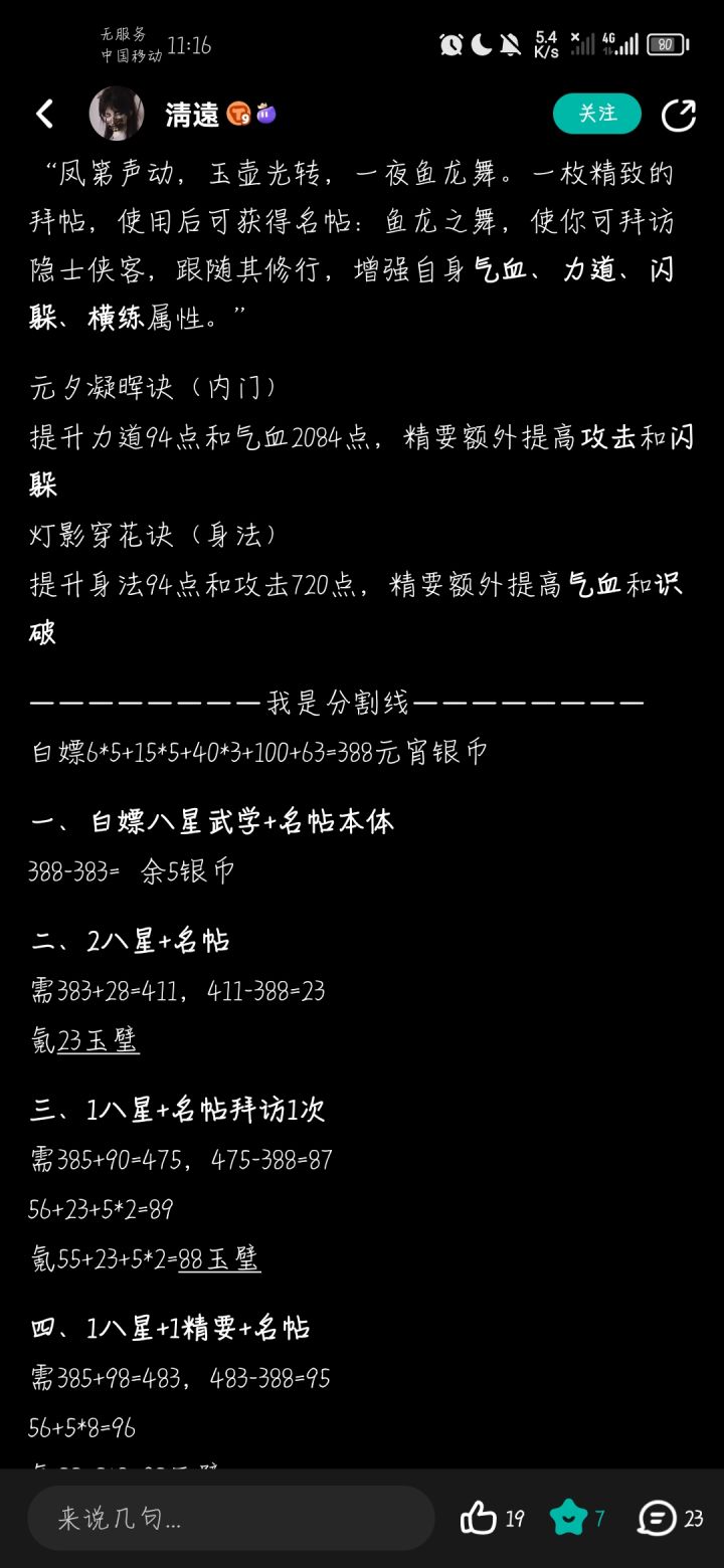 灯火商人-风烟:黄金/玉璧购买元宵银币,猜灯谜小游戏获得银币孙无行:四档奖励兑换乱髯叟:签到五天,共1珍珠,63银币,1金箱子,2气海丹,20番茄,36664黄金孟云归:八星武学及其精要,名帖兑换“凤第声动,玉壶光转,一夜鱼龙舞。一枚精致的拜帖,使用后可获得名帖:鱼龙之舞,使你可拜访隐士侠客,跟随其修行,增强自身气血、力道、闪躲、横练属性。”元夕凝晖诀(内门)提升力道94点和气血208