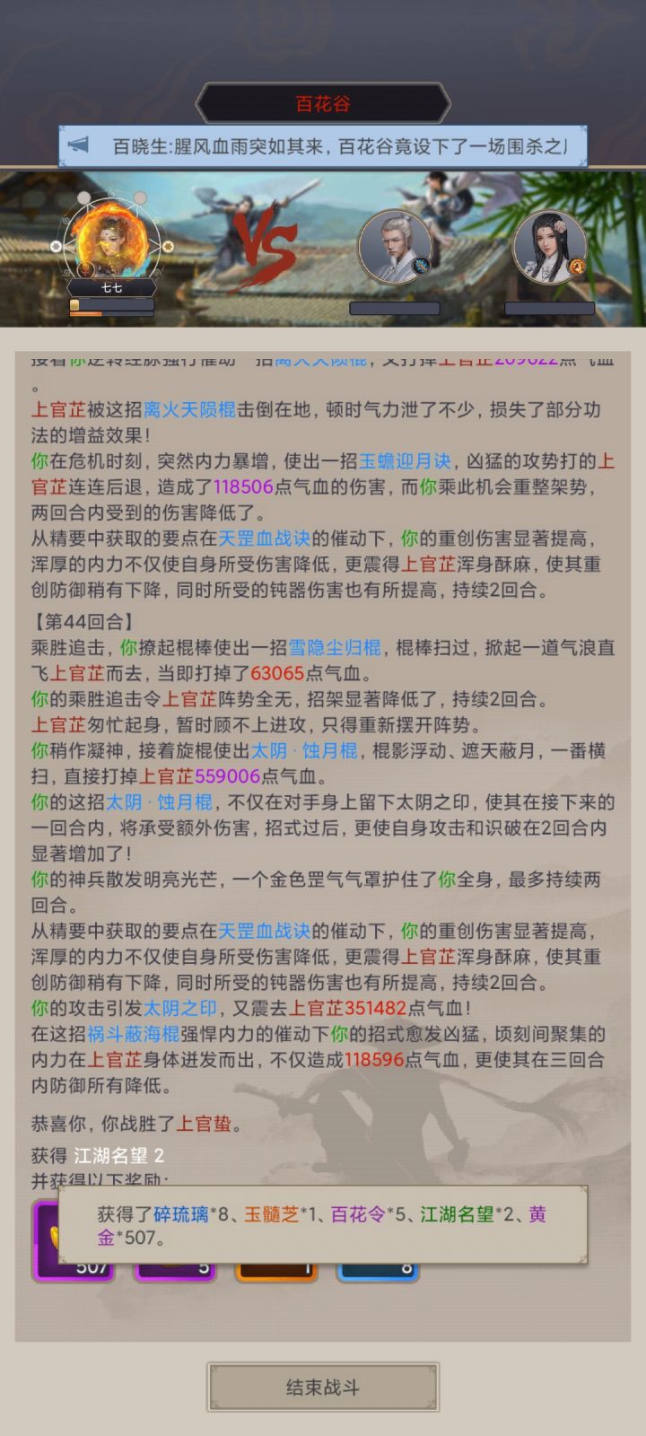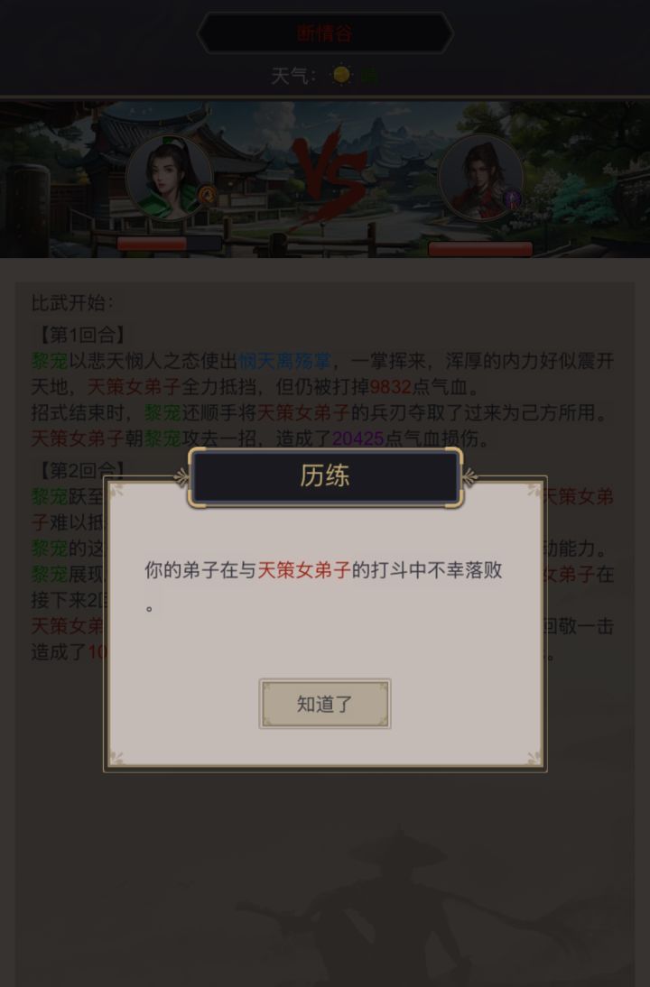 打完藏剑进医仙 直接打了萝莉一个残血 本以为赌几次过了 没想到是开局即巅峰 后面这么多天就打出一次残血 今天日常赌图 晴天飞蝗 运气好过了 名刀真解立大功。进了下断情 打完第一个怪 然后俩弟子都输了 减15属性 第二个打不过了 难道断情必须有俩个能打过对面的弟子才能玩吗?