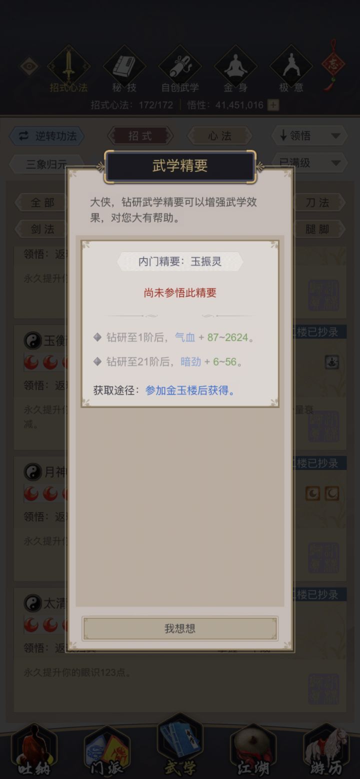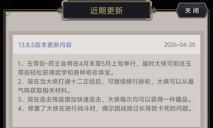 1、玉带街-药王会将在4月末至5月上旬举行,届时大侠可前往玉带街轻松获得武学和各种奇珍异宝。2、现在当大侠打通十二正经后,可继续修行脉轮,大侠可以从蜃气阵获取相关材料。3、现在追击残寇增加快速追击,大侠每次均可以获得一件藏品。4、修复了大侠在进行战斗时,偶尔因战报过长导致卡死的问题。
