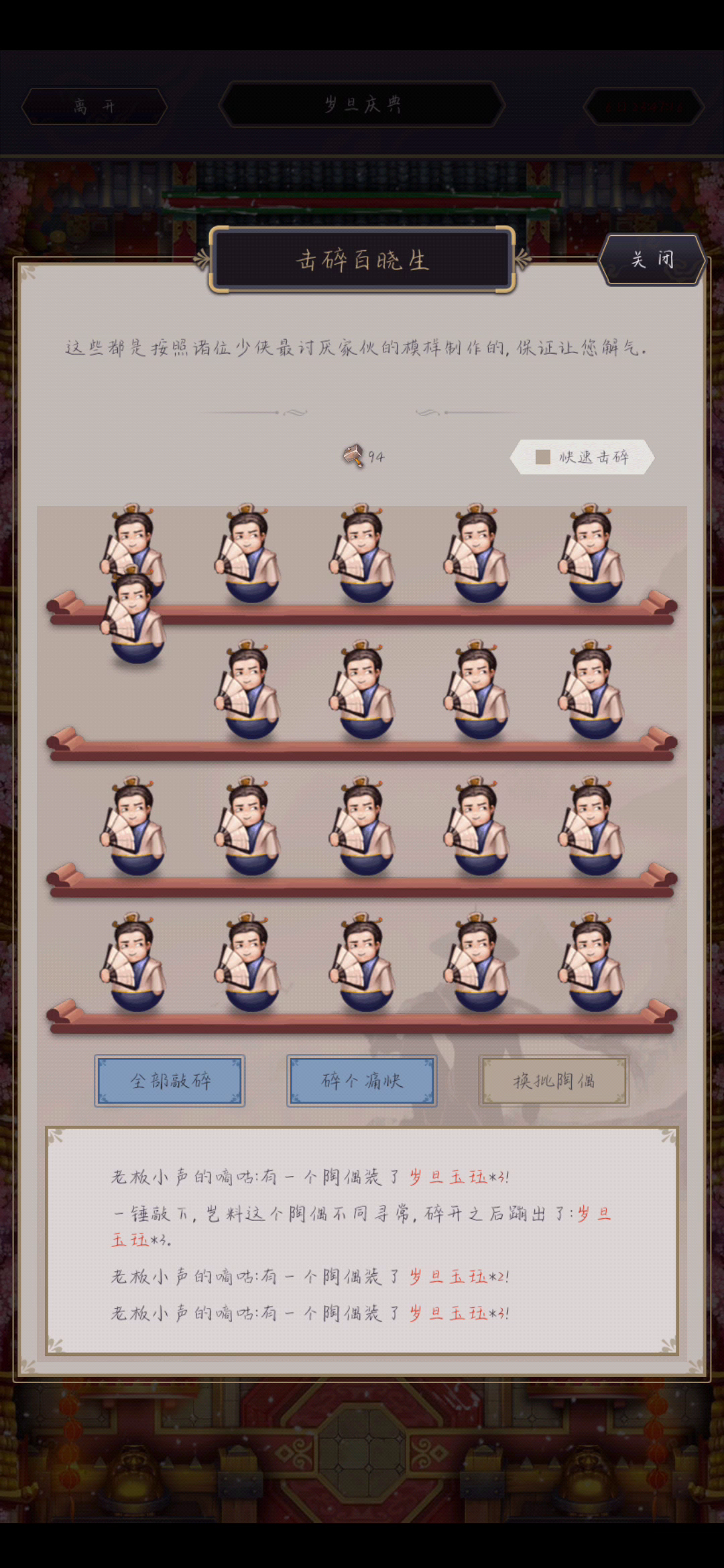 今天拿了90多锤 第一锤老板已经是嘀咕了3个玉,全砸了,出了3个 第二锤老板没出声,我以为是没有玉,全砸了,出了一个,看来正常情况下保底是有一个的 第三锤,老板嘀咕3个,本来想刷新的,奈何老板嘀咕的太多了,没刷,直接敲了 第四次,刚好老板嘀咕了一个玉,我就刷了七次也没出现老板嘀咕,本想着像第二次一样出个保底,可是没出玉 总结,没事别用平安福刷新,可能会吞玉,估计程序是把这批陶瓷全砸了才会刷新出新的玉,用平安福刷新相当于你这批陶瓷你没砸完,它是不会刷新玉,你砸完刷新的那批陶瓷它才会重新刷新,但是你这批里是没有玉的😅 测试仅个人,为少数,数据不是很充足,有不认同的大佬可自行测试,谢谢