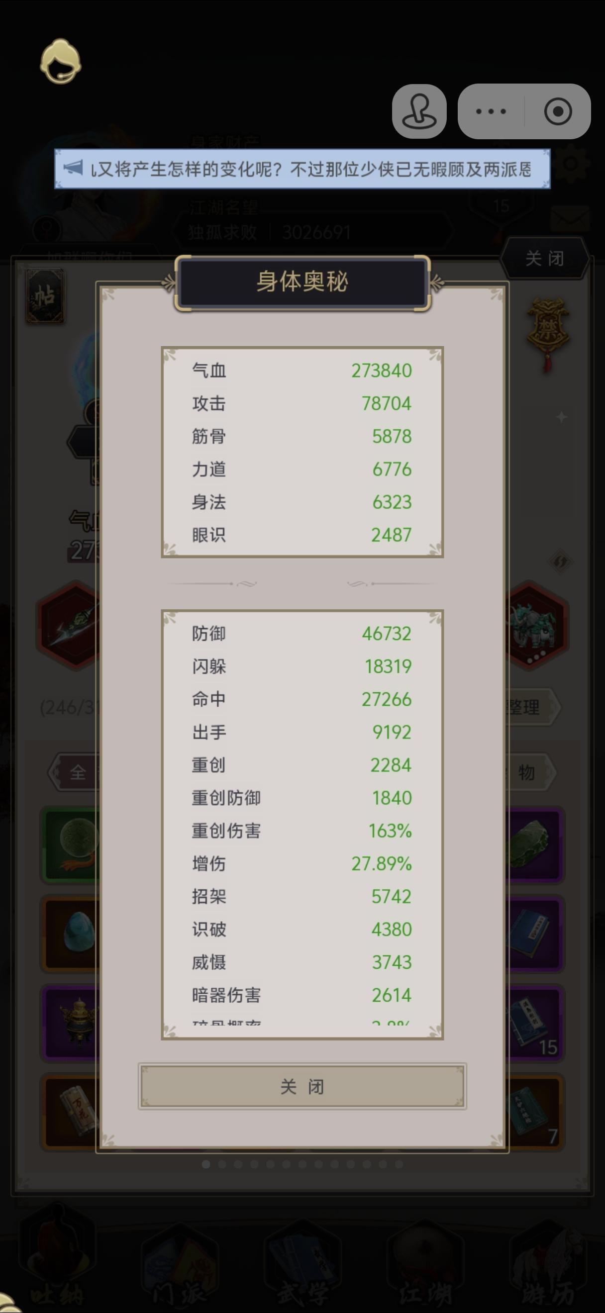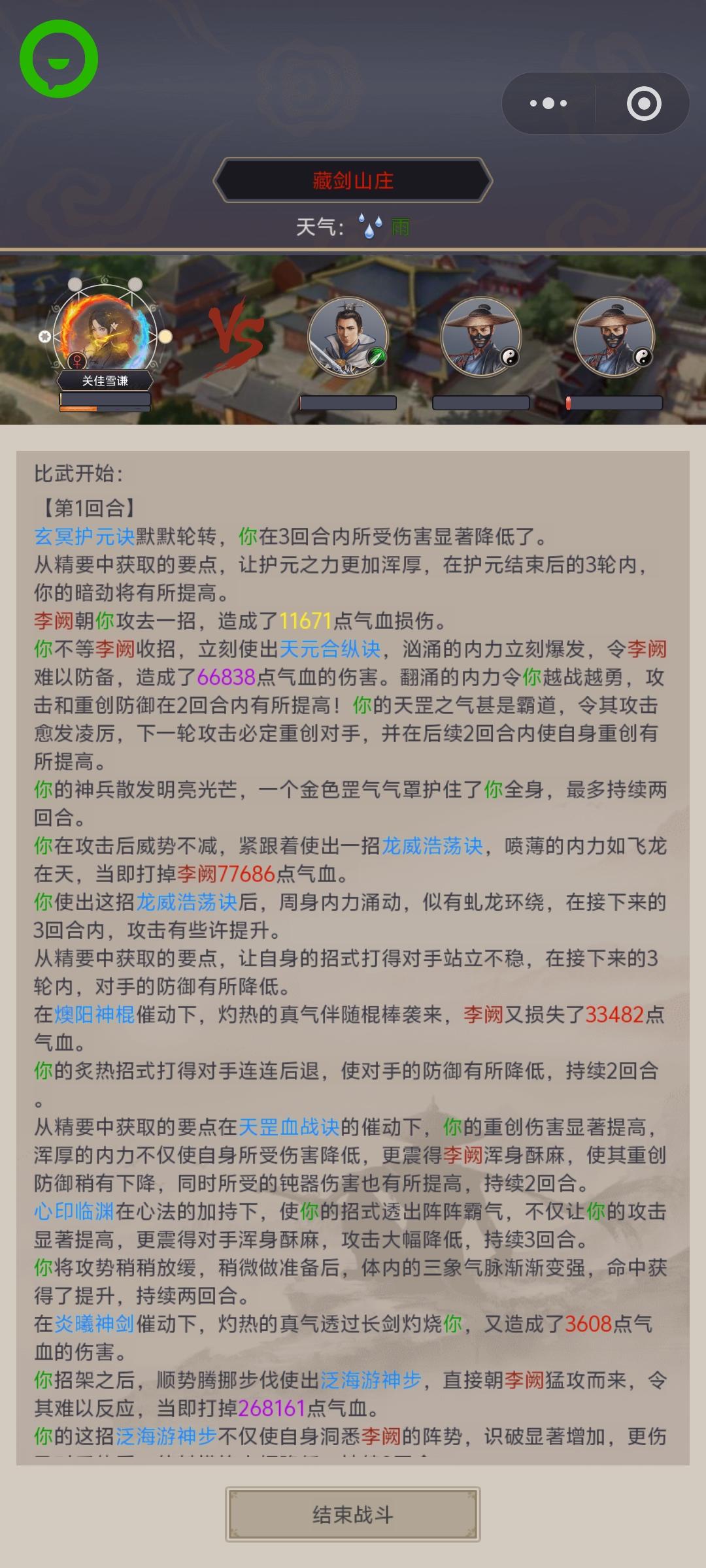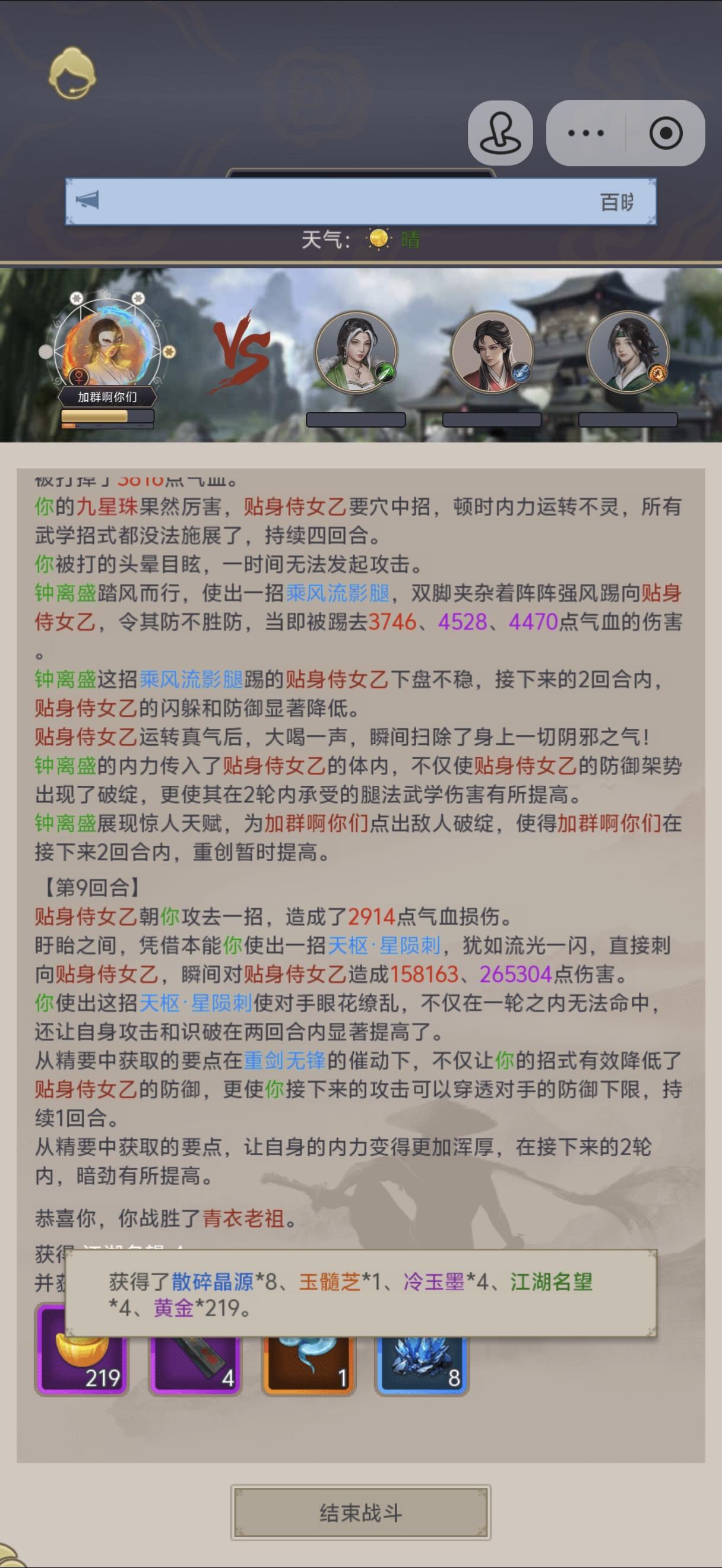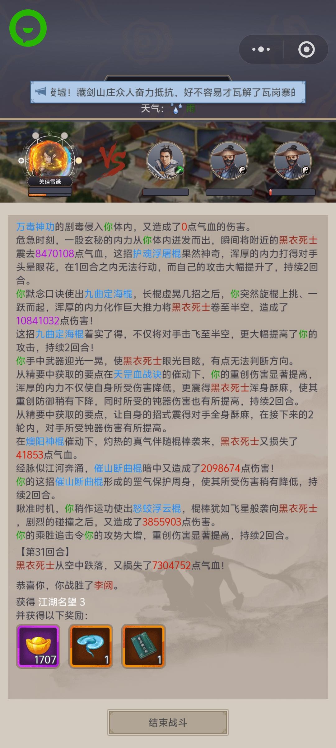 #这就是江湖 不知道咋回事直接过了,刚过唐门还没一个月呢。雨天飞蝗。好像是运气吧撑了31回合。 本来要刻战报的,去医仙岛试了几下给冲没了。丝血顶了好几回合,应该可能是藏气苟命了。