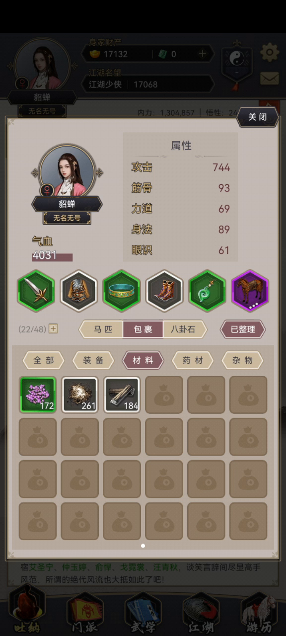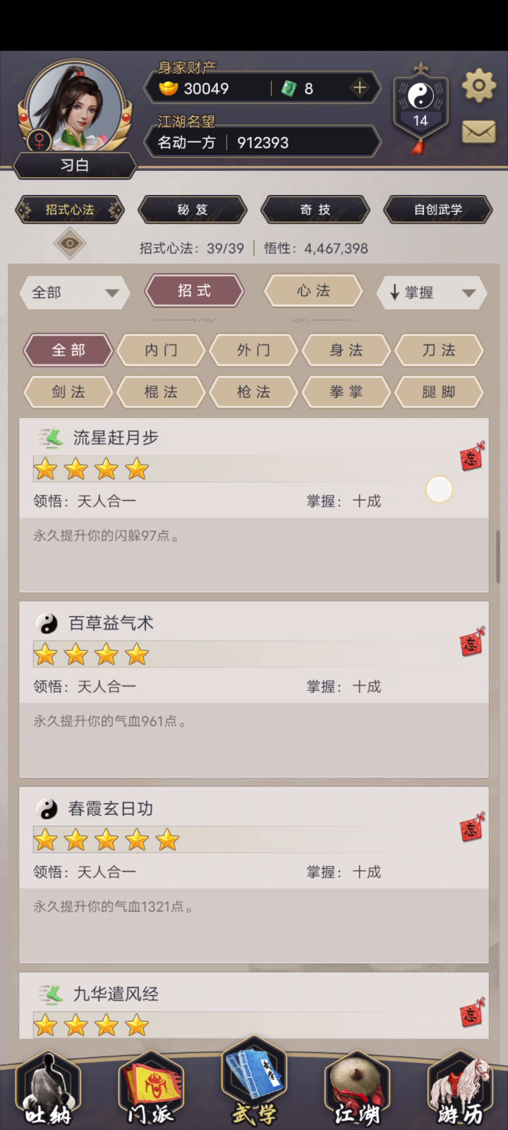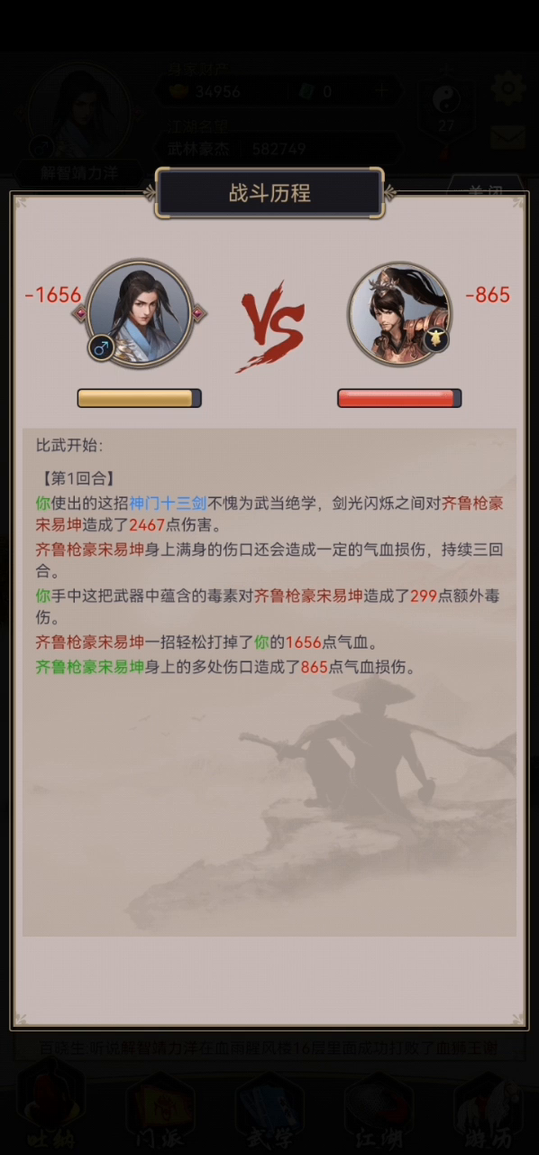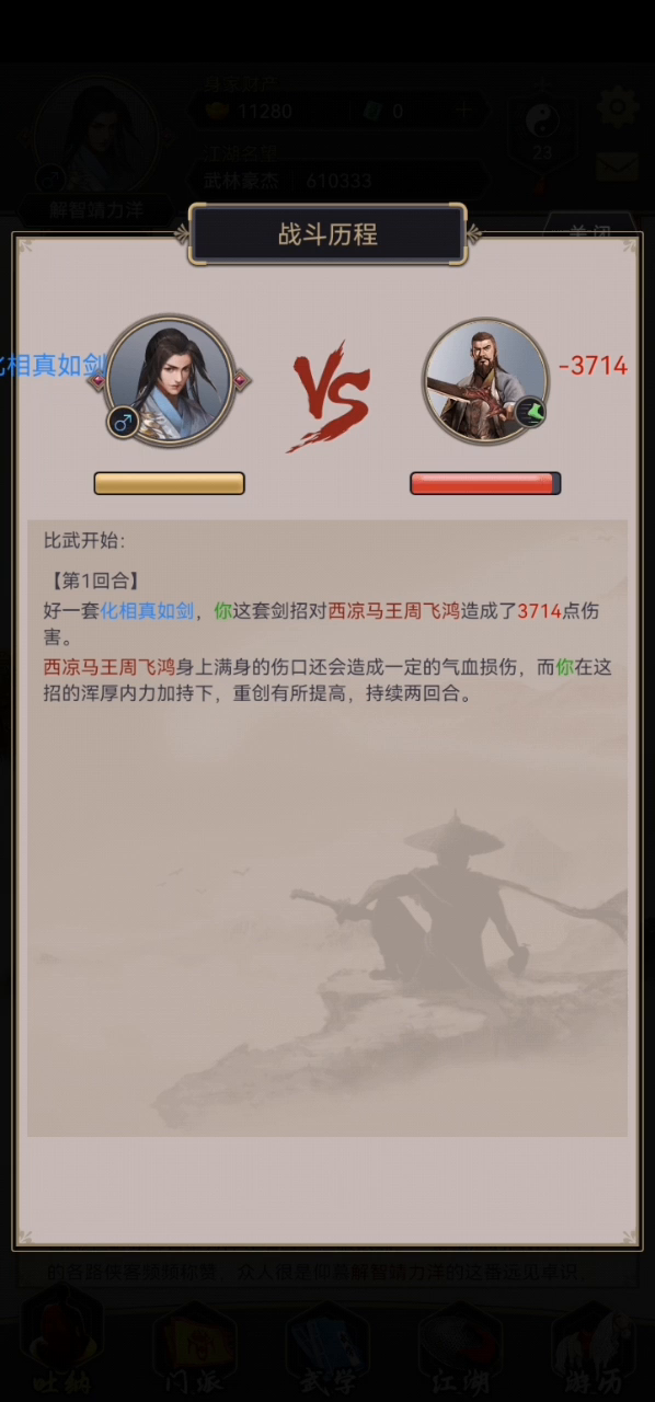 暗器三十多的冰魄针暴雨。之前就有试过,武学全触发差一丝,这次是突破等级属性有增加去试了几次打过的,所以这次应该不是靠脸过的,只不过因为武学没满才重复打了几次(就前后脚打的,之前那次挑山这种招式就没怎么触发)所以各位大侠武学满触发,且属性差不多的情况下应该是稳过的(心法没满,准确来说刚学)