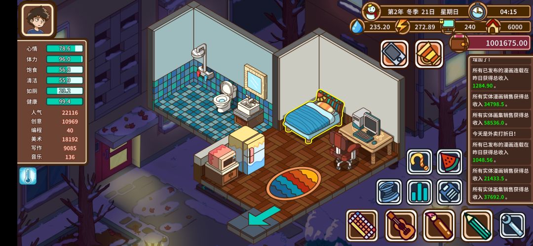 这游戏剧情挺简单的,但还是有代入感,一周目赚医药费的时候真是觉得压力山大,一周1w2太难了,最终100%成功率救活了妈妈,却也只赚到30几万草草结束。后来看了些别人的攻略也自己总结了一下,最终达成100w成就。 首先这个游戏的赚钱系统,由于是翟楠线,所以就只探索了,小说,漫画,画册,接绘画单。由于游戏时间两年固定,所以怎么在单位时间赚更多的钱就是最终能否达成成就的关键。在不同的阶段选择当下最优的赚
