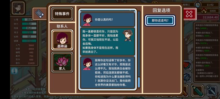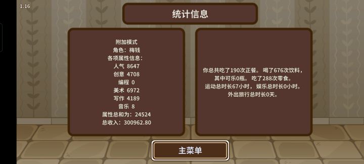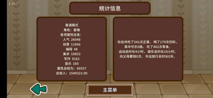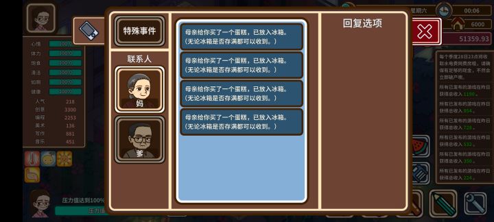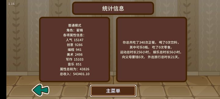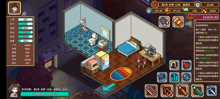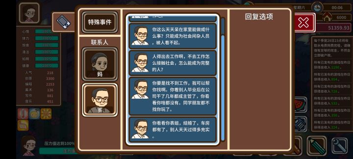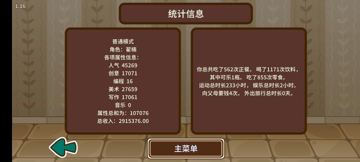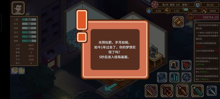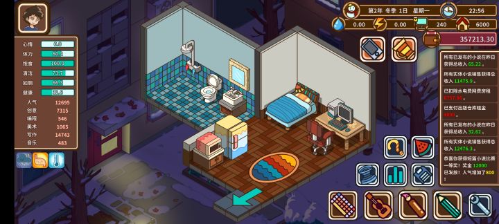 每次没有找母亲要过一分钱,因为代入感太强 ,母亲生日那天给了6k,前期普通药不断供,但收支还是平衡。后期即便是不出版小说,也能百分百成功救活母亲并且维持房租开销,刚玩的时候没发现出版这个东西,就一直写付费小说,不流行了就换季写新题材。我开局一直学习写作网课,没多少钱之后就去写付费小说,每次的题材都是当季流量最高的,从刚开始的100,200块到每天一两千。每季小说比赛都参加,前中期虽然拿不到前