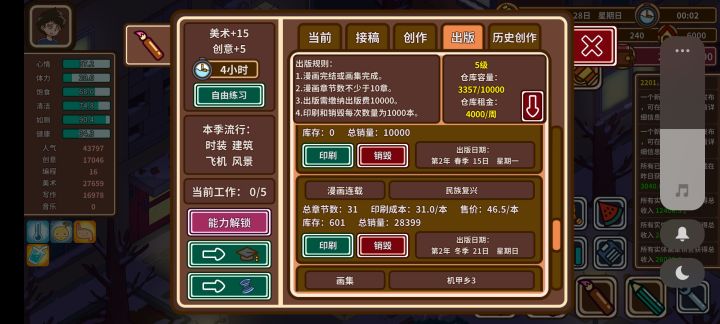 感谢大佬们的攻略,让我一波到位。最后两周小说漫画陆续出版后限制我的就只有仓库上限了。体力条甚至健康条绝大多数时间都可以是空的。画集真的赚钱,为了迈过3万4的门槛(1万出版费+2万4印刷费)前期找妈妈借钱是值得的。妈妈治病一共可以买12次药,而哪怕最好的商单我都没见过超过两万的,出版画集才能脱离苦海。我自己的节奏是春季学完美术五位数以下的所有付费课,非必要的免费课先不学,然后整个夏季都在接