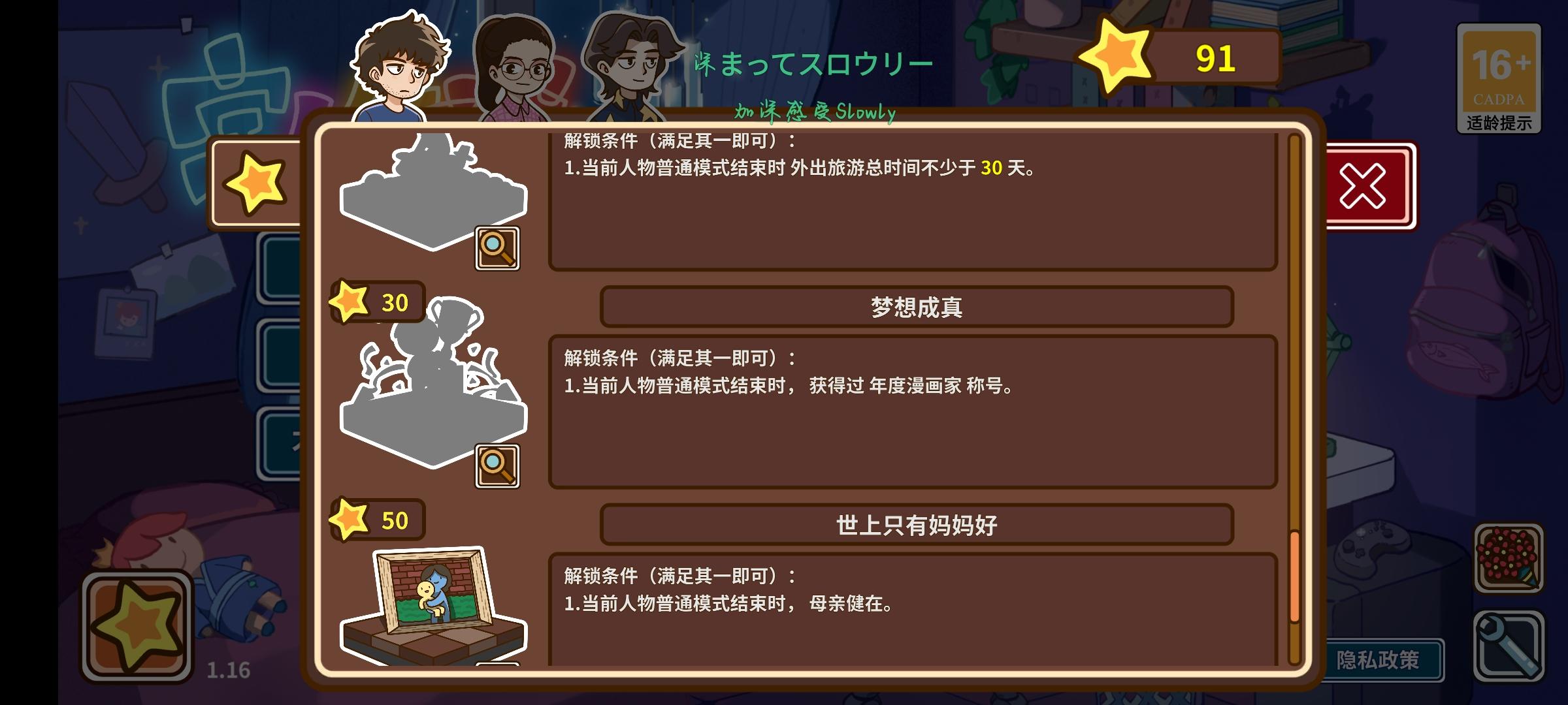 这游戏剧情挺简单的,但还是有代入感,一周目赚医药费的时候真是觉得压力山大,一周1w2太难了,最终100%成功率救活了妈妈,却也只赚到30几万草草结束。后来看了些别人的攻略也自己总结了一下,最终达成100w成就。首先这个游戏的赚钱系统,由于是翟楠线,所以就只探索了,小说,漫画,画册,接绘画单。由于游戏时间两年固定,所以怎么在单位时间赚更多的钱就是最终能否达成成就的关键。在不同的阶段选择当下最优的赚