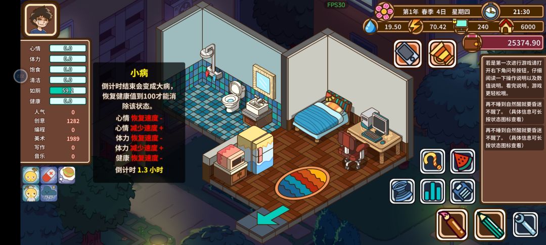 相对于常规的手动操作吃饭喝水还要算保质期,这个更加轻松无脑,无论是游戏外的操作效率,还是游戏内的时间效率都更加离谱。 即使是自动玩家,也建议开局12天走4个循环把学习给学了。这个操作第一个月至少能拿个三等奖3000。 原理是卡小病debuff三天时间极限值,把补充属性的时间拿来工作学习,因为debuff不影响工作效率,等时间快到了把debuff解除即可。 具体操作如下 以3天为一个周期 第1天找保