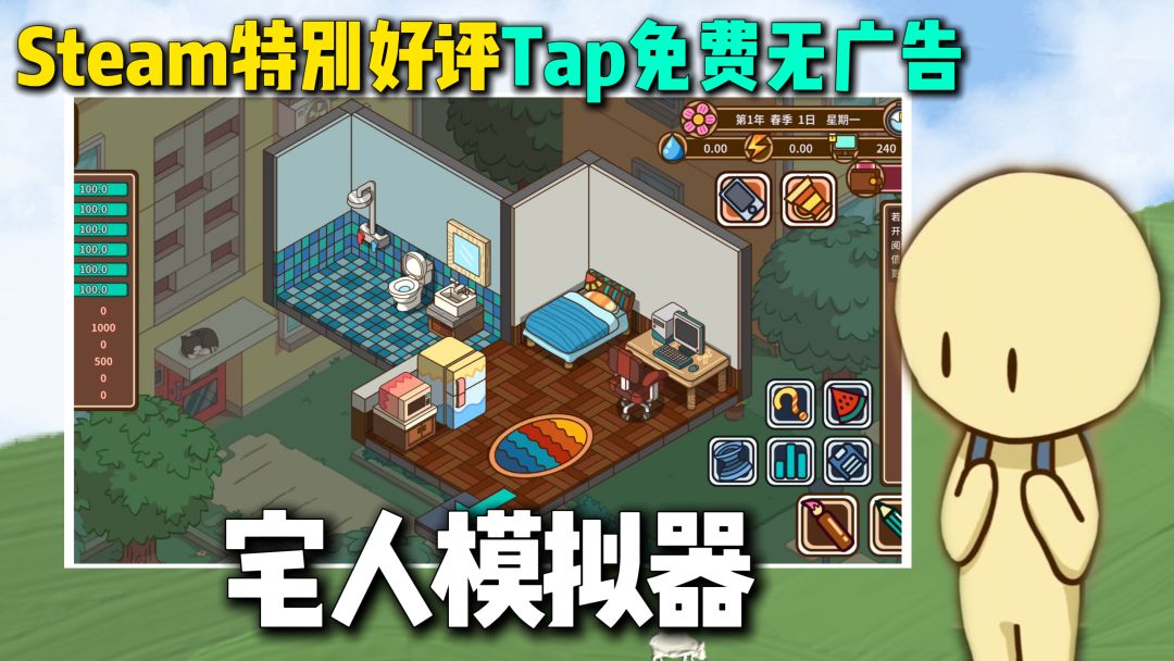 #游戏种草计划 #休闲游戏 #宅人传说 #养成 #游戏推荐 🎮这是一款非常有难度,让你有强烈的挑战欲望的模拟养成游戏~《宅人传说》 ⭐️难度系数满满,颇有挑战性。与现实生活接轨的种种难题:房租水电费,吃喝拉撒睡,生病了还要去看医生等等。处处花钱,你的钱又怎么赚呢? ⭐️游戏场景互动效果很棒。洗澡,如厕,睡觉,运动等等都有幽默诙谐的互动动画,很有趣。 ⭐️自由选择。如游戏难度,如赚钱方式可小说,或