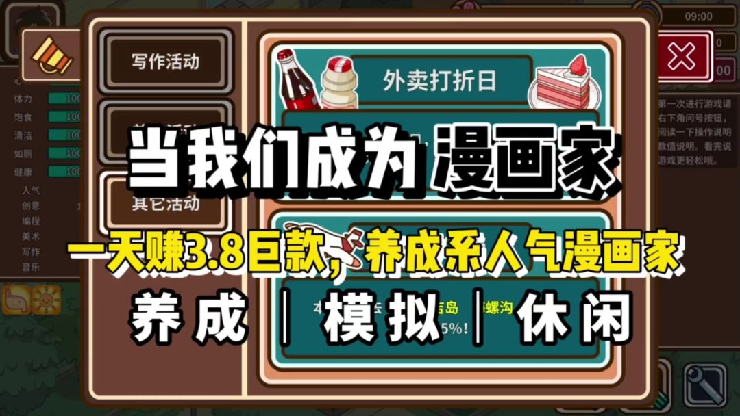 全自动全部开启,如果有耐心可以自己挑食物吃,多加健康和美术。前十天把美术第一行和写作前两个网课学完,然后把活动作品做了,连载一个付费漫画和免费小说,同时进行,写两张小说画一张漫画,写脚本的时候顺带着把小说写了。这样把小说连载到二十多,漫画连载到十的时候,第一个月差不多还有两三天,可以学一学美术网课,一直学到夏季学完三个网课,美术差不多就五千左右了,期间母亲的钱全不要,让母亲攒着可以让母亲的手术成