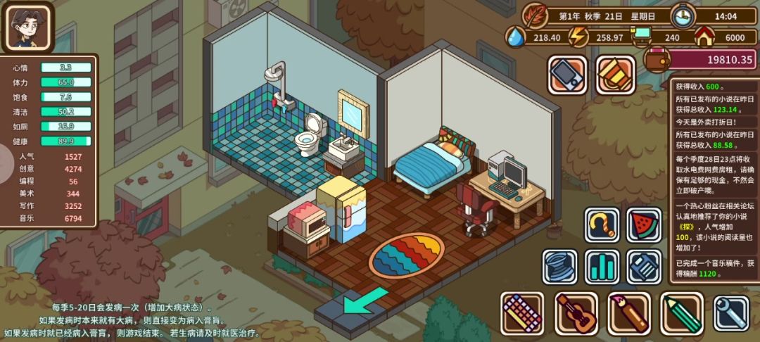 1.体力太容易消耗了,还没做什么就睡觉去了,希望可以有体力药水之类的2.可玩性低,能不能增加装饰房屋,还有就是有钱了能不能搬家之类的3.打出破产就强制结局,瞬间就不想玩了,不想从头开始我真的在真情实感地挣钱就母亲啊啊啊啊啊啊啊啊啊啊啊啊!!!!!天天吃打折馊饭!!!你不能这么对我!!!!!!