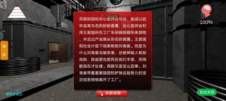 这一次我终于首次尝试了完全靠自己找线索,也找到了百分之二三十,最后还是要看大佬攻略。 最后一直卡97%,看了大佬攻略才知道是漏了“工厂标语”和“炉喉”。 这个视频的内容是:先浏览一遍自己的每一层线索,然后卡门里,站立加蹲下还左右移动以尝试卡进门,最后……好家伙,门直接搞消失! 再见DLC王爱国,我要去通杜翠兰了~