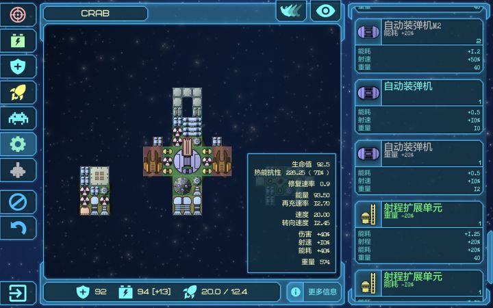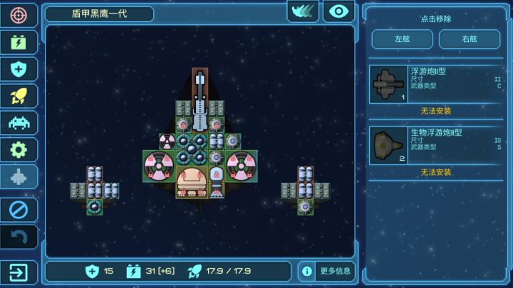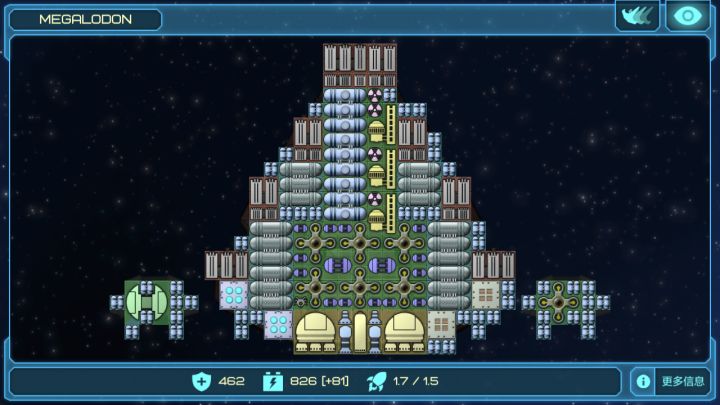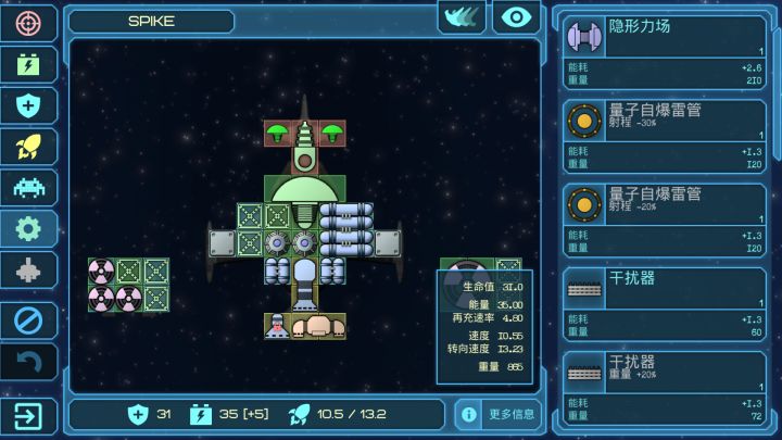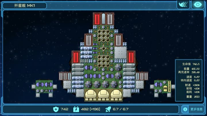 现在玩到20光年左右,处于开荒期,发现一个很有趣的配置就是这样。初始船里面飞的很快,冲脸放闪电那个。配上前置护盾(从初始激光船上拆下来的)以及一个补血光束还有两个闪电m3。见到船开盾开激光直接糊脸(消耗十分低,我35能量能开最少10秒)。前期(我只玩到了前期)所有非导弹都能秒,导弹舰走位绕后。只要撞到敌舰都能在三秒内解决。其他舱位全出高速自爆(我现在只有8个舱位,三个主力,其余都是自爆,各种