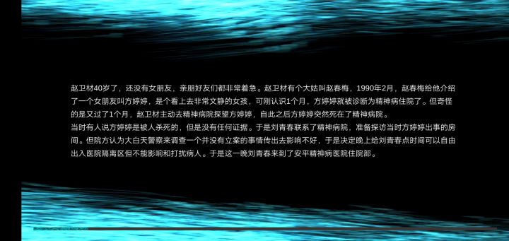 案件:方婷婷时间:孙美琪案发后地点:安平精神病院背景:真相还原:方婷婷是女心医师会手术师方康生的女儿,靠着赵春梅与张工尹(张红君)认识了赵卫材,被父亲方康生知道要求他离开她,方康生不想让女儿卷进来,可是女心医师会组织瞒着他,派张工尹出马,钱思思掩护,于是张工尹又派赵卫材去看望她,赵卫材假装方婷婷表哥进了病房,拿刀片作为诱导工具,再以诱导自杀的方式掩盖,钱思思的地西-泮作为“证据”,希望以