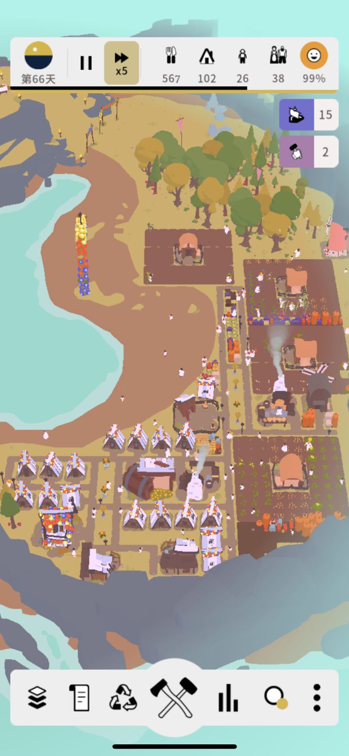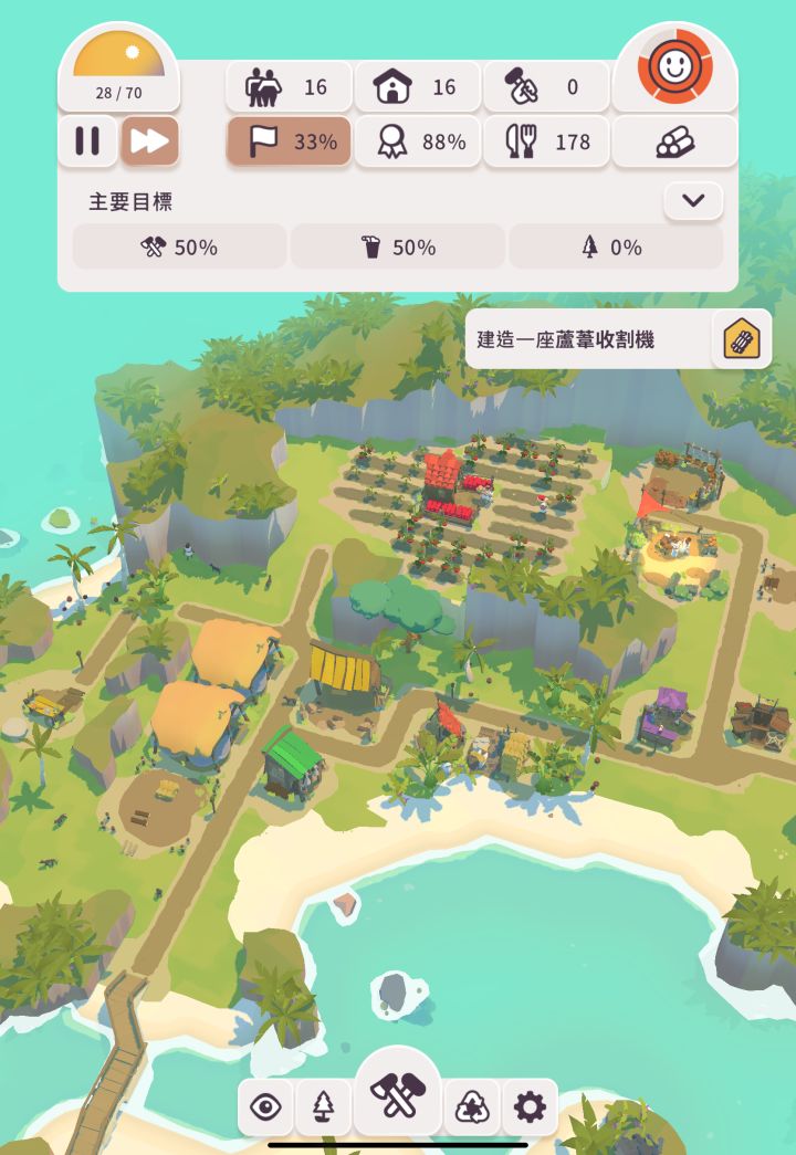 游戏的建筑以及生产链也是比较完整的,比如玩家需要建造伐木工营地,得到木头才能建造锯木厂,锯木厂锯木头得到木板,用木板和木头来建筑农场,才能得到番茄来满足追随者的食物供应。随着关卡的进行,我们在之后会遇到更多的建筑可以建造,同样的响应的时间可能变长,任务也会变难,游戏的容错率来说比较低,建筑链和生产链一步接着一步,可能在某一个环节出现了错误,就会全盘皆输。