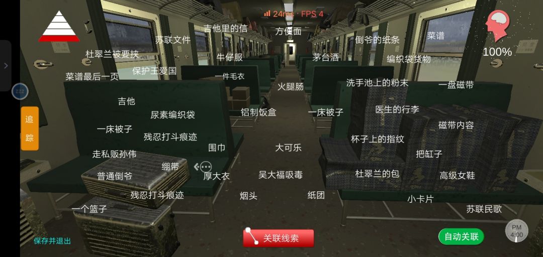 100% 头疼 嗡嗡的 小面积图 但是右下角的时间可以调 每次调的场景都有或多或少的线索 算不上高能——凌晨三点的其中一节车厢有灭霸头和带血的裙子。 关联线索 1.走私贩孙伟=尿素编织袋+一床被子+厚大衣+围巾+一床被子+苏联文件 2.王爱国工友=安全帽+保温桶+工人日报 3.偷听谈话=二锅头酒+白沙烟 4.半仙儿=罐头瓶杯子+倒扣的杯子 5.风铃=一条长裙+车窗上的字+一撮头发+窗外的纸人头+带血的长裙+偷听谈话 6.吴太福吸毒=洗手池上的粉末+杯子上的指纹+小卡片 7.杜翠兰被要挟=磁带内容+吴大福吸毒 8.保护王爱国=杜翠兰被要挟+两个残忍打斗痕迹+绷带+纸团 9.普通倒爷=方便面+火腿肠+茅台酒+铝制饭盒+牛仔服+一件毛衣+大可乐 10.周芳=烟头+走私贩孙伟+女士手套+女士背包+高级旅行包+古拉格文件 11.黑吃黑=辛追夫人+磁带内容+两个残忍打斗痕迹 12.真相=黑吃黑+俄文报纸+王爱国工友+古拉格文件 以上为关联线索 AM9:00 地下的蓝色编织袋可以移开 有一个小卡片 PM1:00 吉他旁有“一盘磁带” 同时一条裙子的旁边的座椅墙上可以拿到列车时刻表 PM4:00 锁着的房门开了 墙上有残忍打斗痕迹以及地上的纸团 尿素编织袋旁获取“苏联文件” PM11:00 获取“半仙儿”线索后 可以翻来倒扣的杯子 要开合两次 可以获得“道士的密信” 就可以唤醒乞丐 洗手池出现粉末 一堆杂物对面出现古拉格漫画 AM3:00 熟睡的人旁有辛追夫人 一条长裙那节车厢 出现一撮头发 窗外的纸人头 以及带血的长裙 放大车窗玻璃 获取车窗上的字 火腿肠处出现倒爷的纸条 黄色皮衣点一下出现厕所钥匙 厕所里面有被棉被盖住的东西 锁着的房间出现烟头(在1点开时一直待在里面到三点) AM9:00 唤醒乞丐打开厕所 获得苏联皮箱 密码是:7855
