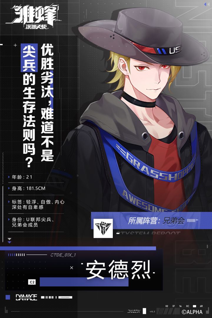 //你好,尖兵。欢迎登录NPSA档案库。//人物资料#序列013——安德烈//爱丽丝正在解码数据……姓名:安德烈年龄:21身高:181.5cm身份:U联邦尖兵、兄弟会成员标签:轻浮、自傲、内心深处有自卑感所属阵营:兄弟会人物资料——“优胜劣汰,难道不是尖兵的生存法则吗?”出身于U联邦的地下实验室,因身体素质好,被施耐德带走后改造成为兄弟会的新型尖兵。因为小时候的遭遇,安德烈