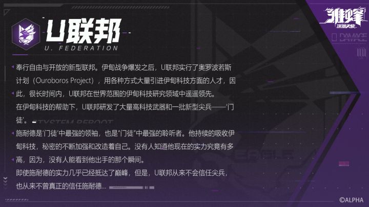 //你好,尖兵。欢迎登录NPSA档案库。//势力组织#序列006——U联邦//爱丽丝解码资料中……组织名称:U联邦组织全称:U. Federation组织简介:奉行自由与开放的新型联邦。伊甸战争爆发之后,U联邦实行了奥罗波若斯计划(Ouroboros Project),用各种方式大量引进伊甸科技方面的人才,因此,很长时间内,U联邦在世界范围的伊甸科技研究领域中遥遥领先。在伊甸科技的帮