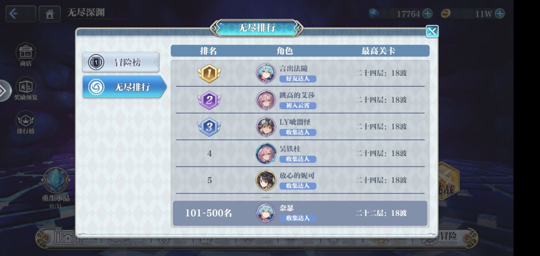 04/02更新: 7.限定英雄的抽取——修正下米迦勒在pvp的倒坦能力 ——————————————————————————— 1.月卡(契约)以及八日任务 月卡可以通过做三天任务完成,但是早买早享受真不是说说而已,第一天买的话在后面大概可以快肝月卡的玩家一步到剧情点吧。ps:游戏内基本没什么排名榜,包括天梯也没有排行榜,唯一的榜就在无尽深渊,只有深渊和冒险进度榜。下附唯一排行榜图 八日任务在第四