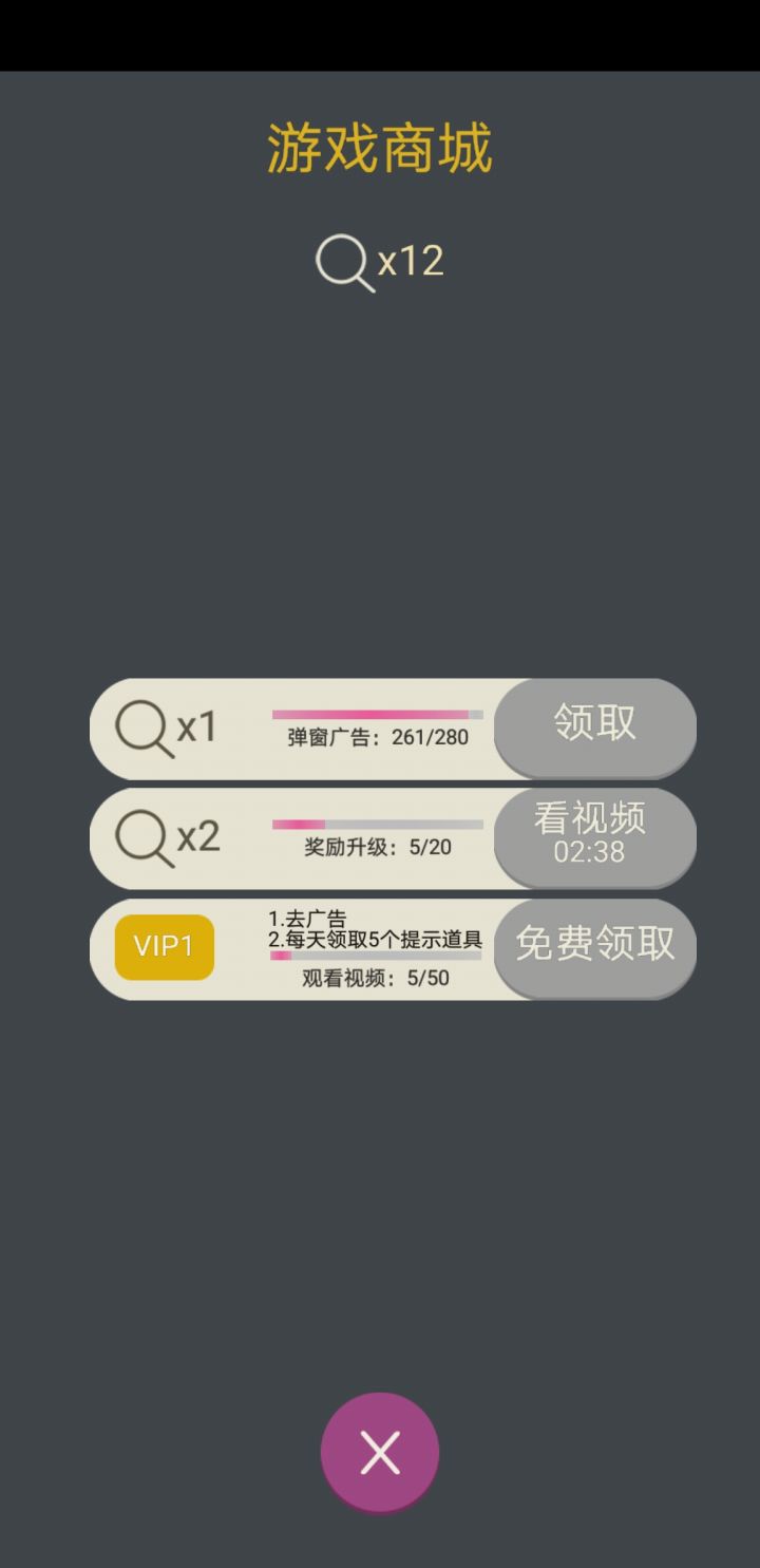 突然发现了怎么去除广告😐第一张图是我一直肝的,看广告差点让我劝退第二张图是发现看满50次去广告图三、四是我肝了两个小时看完的广告(因为一个广告间隔三分钟,所以我一边玩一边刷,过了两百多关七巧板,游戏期间广告看了一百个😑)