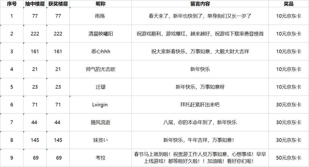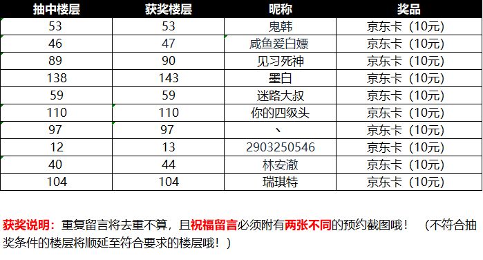 恭喜以下小伙伴获得奖励哦~请尽快在1月17日之前在留言区回复您的邮箱账号用来接收奖励哦~(逾期回复视为自动放弃奖励!) -------------------------------------- 2020即将过去,我们也在这里与大家一起度过今年的最后一段时光,福利也要跟着2021的脚步一起过来了!即日起至1月3日,关注并预约本游戏后,在本条帖子下评论祝福, 评论满30条,即有机会获得京东卡(10