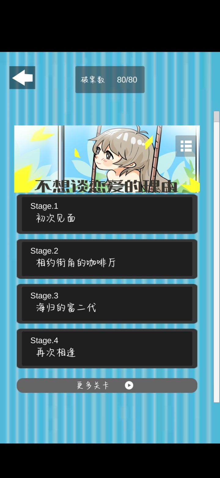 通关了,我感觉最后女主没找到真爱很遗憾,但是stage1,的那个男的头像让我弄了好久,我知道是为了做铺垫,但是就感觉不太好,希望作者能加一下找到真爱,我还是比较喜欢皆大欢喜的结局。。然后那个到那个纹身男的家里,那只猫让我想了好久。。不过,说实话,女生相亲时候的观察力这么厉害。。不敢相亲了。。。