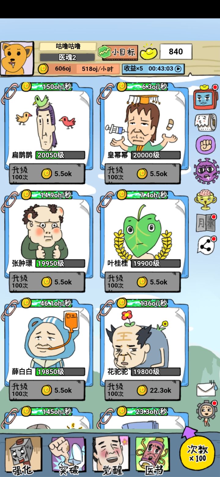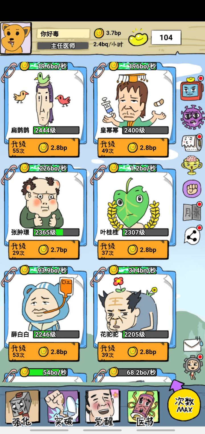 游戏其实很简单:把每个神医都尽快升级,适当的时候看看广告获取更多资源,然后挂机就行了。