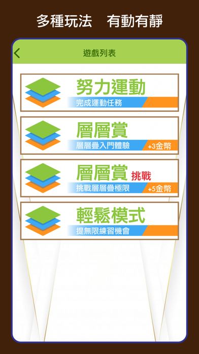 一個訓練手眼協調嘅遊戲「層層賞」。由零開始,疊起30層方塊,實在不容有失。今次,還加入運動元素。一方面提醒大家要常做運動,所以設有步數、距離或樓梯等每日任務。另一方面,也讓大家挑戰唔同難度嘅層層疊遊戲。