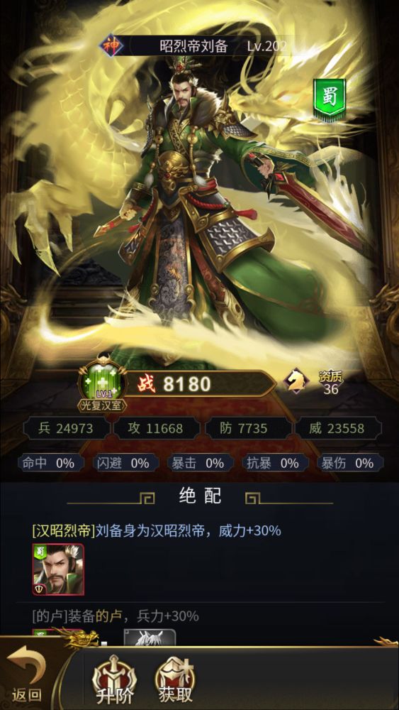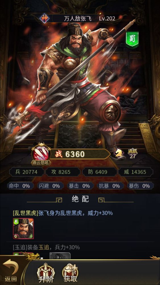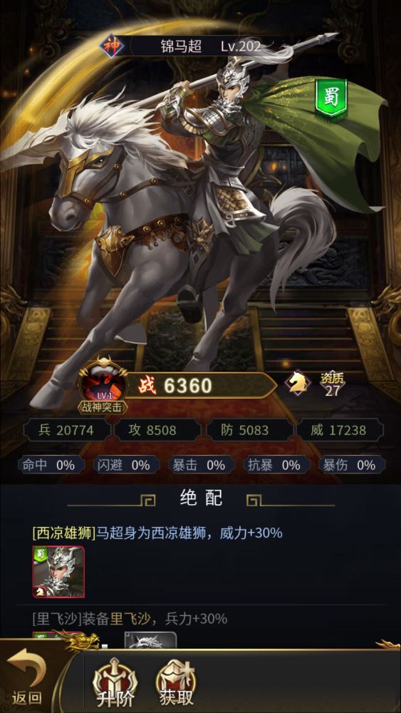 小传魏延,字文长,是蜀国著名大将,为蜀汉的建立立下了汗马功劳,刘备入川时魏延因数有战功被任命为牙门将军,刘备攻下汉中后又将其破格提拔为镇远将军,领汉中太守,镇守汉中,成为独当一方的大将。魏延镇守汉中近十年,之后又屡次随诸葛亮北伐,功绩显著。绝配[汉中太守]魏延身为汉中太守,威力+30%[西蜀地形图]装备西蜀地形图,兵力+25%[三尖刀]装备三尖刀,攻击+30%[陈到]配属副将陈到,兵力