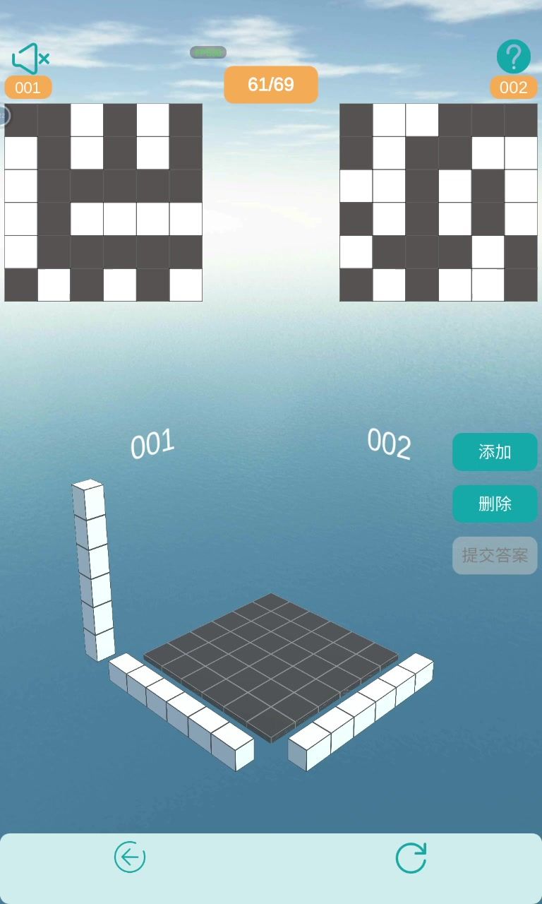没有思考全是技巧 分层分析 先看001第一行哪几个格子有阴影,然后在立体图里点亮 然后看002第一行,哪几个格子有阴影,在立体图里点亮 然后点亮高1,添加,第一层就好了 然后每一层以此类推 建议卡关的时候用 因为用了这个技巧之后就没什么思考的乐趣了,慎用