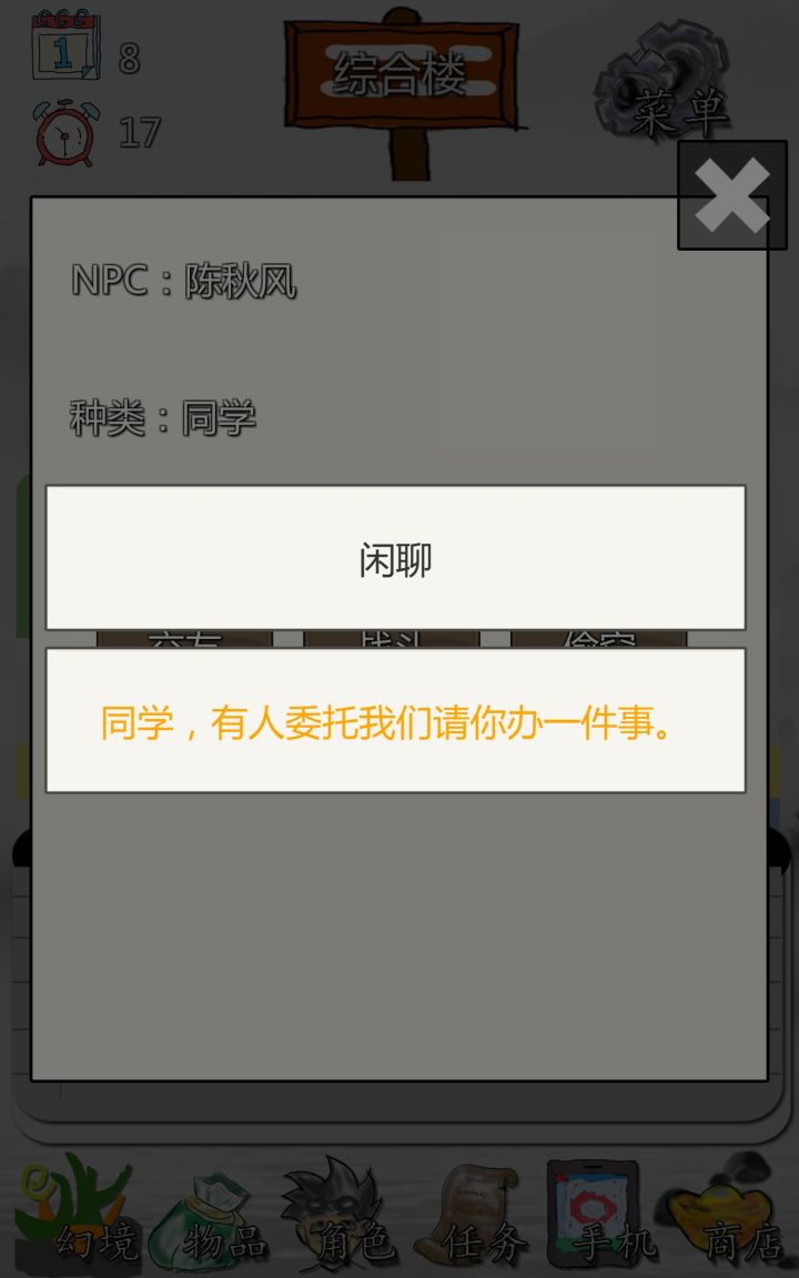 进游戏后先做主线任务,去文苑吃饭需要与文苑的npc对话,不是真让你你买饭吃……邀请入队需要每名队员对应的角色碎片大于1个就行,然后再地图上与他对话,入队4人的角色碎片在商城里抽第一个包就行。手机的开启时间与你背包里有什么样的手机有关,一共三种手机,最快2s开启时间。手机里的打车业务有bug,网购界面可以在上面的搜索栏输入物品名称,点击小的放大镜搜索购买。不知道物品名称可以在百科app搜索物品清