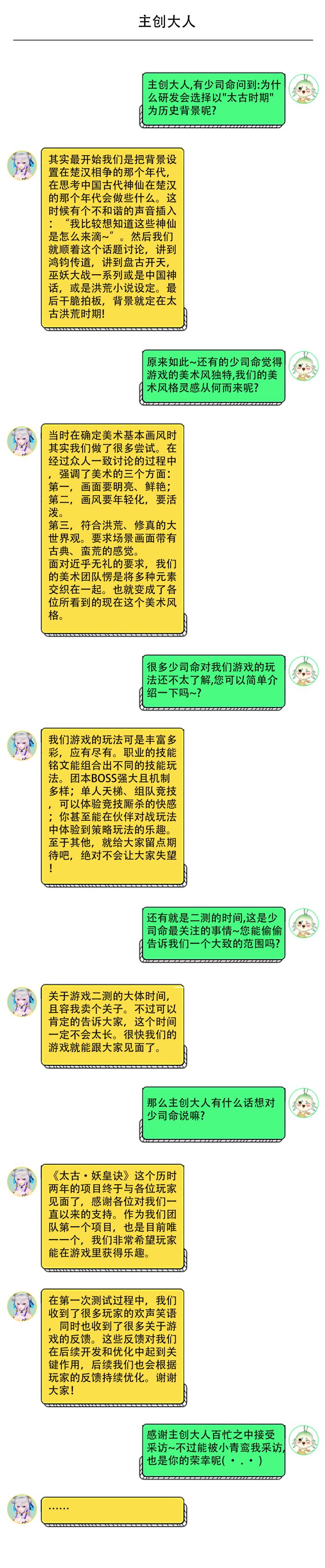 近些日子,小青鸾收到了许多少司命的私信,大家都对《太古·妖皇诀》手游表现出了浓厚的兴趣。还有不少少司命提出了一些关于游戏剧情、游戏开发的问题。现在,小青鸾就化身记者,探访一下主创大人的制作机密~不知主创大人的回答有解决少司命的疑惑吗~?如果还有问题,请在帖子下方或者我们的官方渠道留言哦~希望大家多多提问,我们会在近期回答大家的问题哦!官方Q群:769793187官方微信公众号:太古妖皇诀