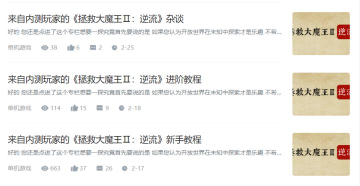过两天新版本的逆流就要发布了 我姑且算个新版本老玩家(见1p) 内测期间因为新手教程的暂时缺失 我写了几篇攻略(见2p) 虽然文笔非常稀烂 但勉强能读懂 希望能助初次游玩新版本的朋友们安稳度过新手期 我把文集的链接放在了下面 再次感谢您对《拯救大魔王2:逆流》的支持 谢谢https://www.bilibili.com/read/readlist/rl380493