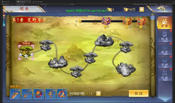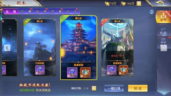 1.武器本玩家每挑战一关可获得三次翻牌机会,在8张牌中选择3张,并且分别可以花费10、20、30绑元额外购买一次翻牌次数,每一章节挑战到一定星数,还可以额外获得一份奖励。2.防具本保护仙女不死亡的情况下防守住怪物的进攻,击杀来犯的怪物获得它们掉落的升级材料可提醒防具的等级。3.品质本每一层总共有10关,每一关有挑战时间限定,规定时间内如果无法通关则挑战失败,可以再次进入继续挑战,继续挑战