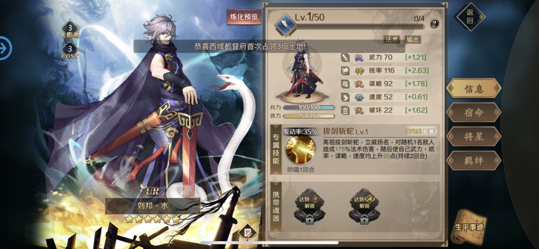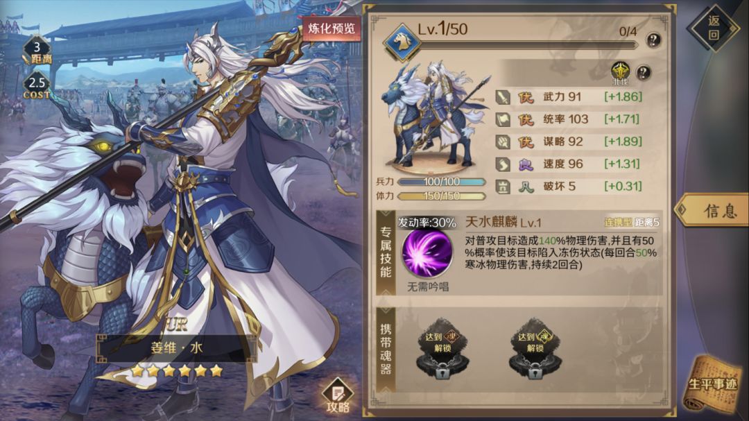 新人进入游戏做完新手任务 送太史慈黄忠凌统等ssr将领其中前期太史慈使用他来开荒非常香! 技能搭配如下 水姜维:可以使用魂器振奋号角(通过水维吉尔炼化)搭配魂器谋士兵符(通过火狄仁杰炼化)因为水姜维属于连携将领所以通过振奋号角谋士兵符的技能特效完美搭配出来可以打出爆炸的伤害可以放置于前锋中军 振奋号角特性:使自己武力增加20点(受谋略影响,持续2回合),并且有(100%概率使自己进入连击状态1回合